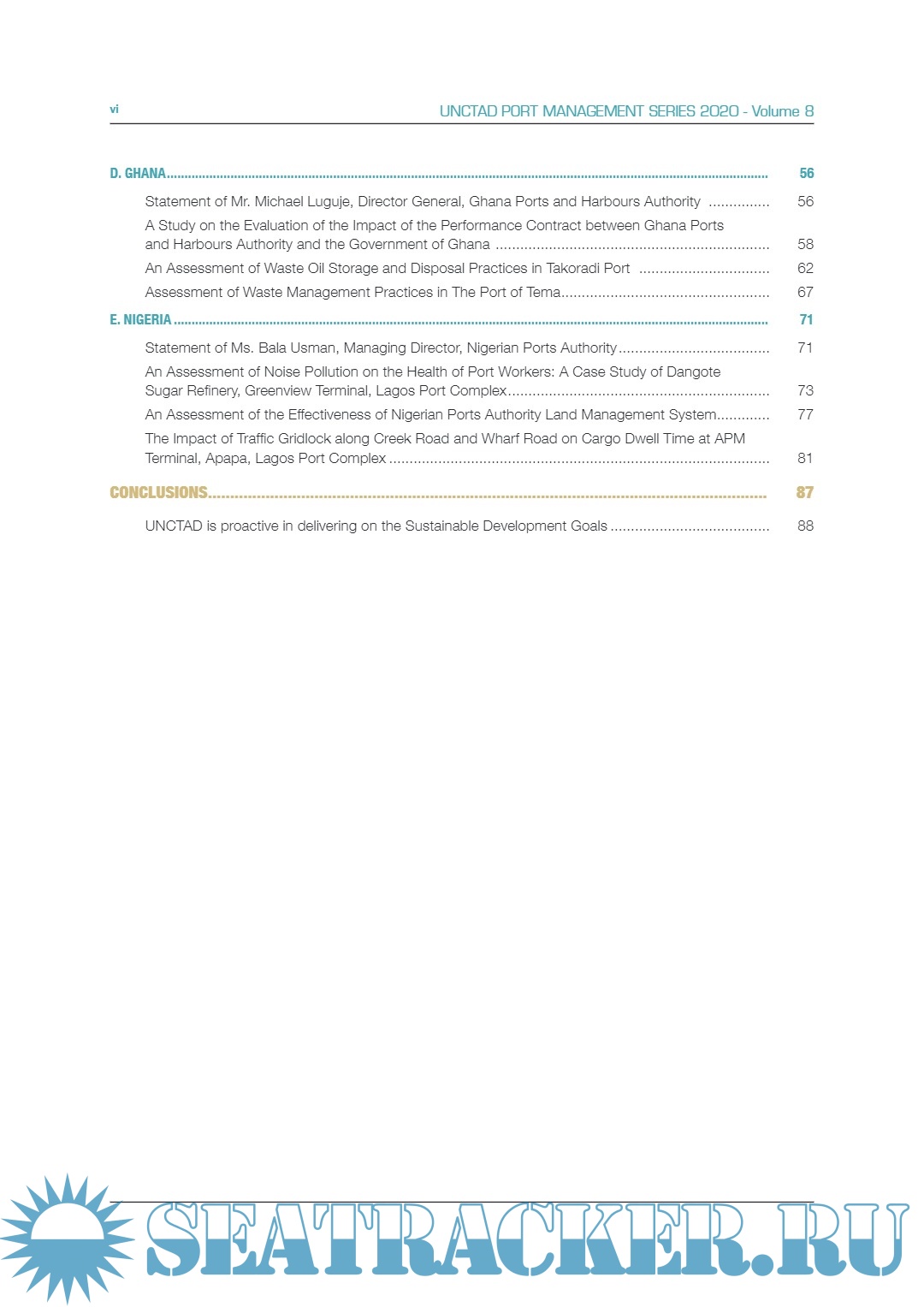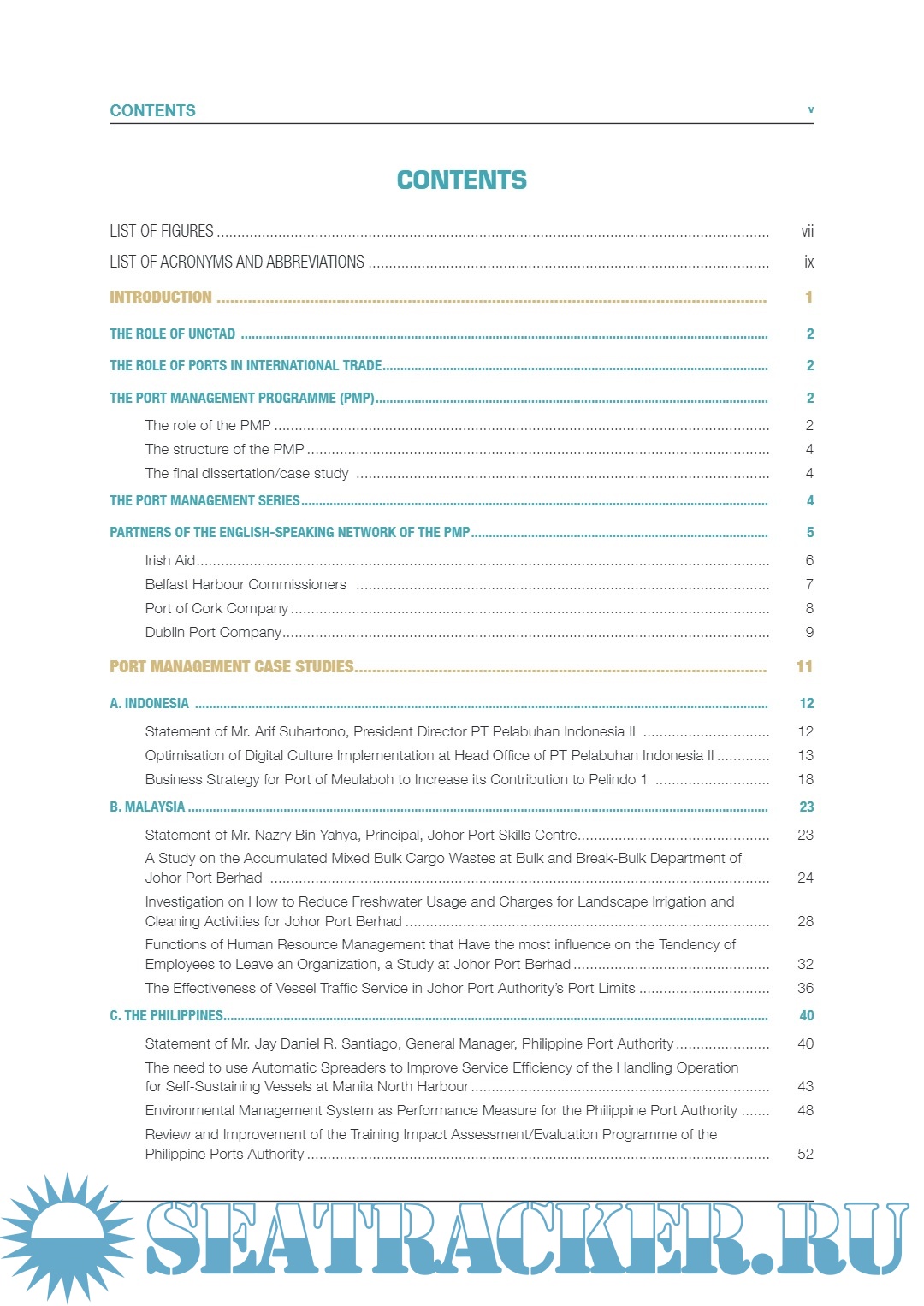 Description: This publication was produced within the framework of the TrainForTrade Port Management Programme of the United Nations Conference on Trade and Development (UNCTAD), financed by the Government of Ireland and the participating ports of Ghana, Indonesia, Malaysia, Nigeria and the Philippines. The programme receives support from Dublin Port Company, Port of Cork Company and Belfast Harbour Commissioners. The Port Management Programme – English Speaking Network – has benefitted since its inception in 2007 from the unstinting support of Ireland’s ambassadors in the participating countries. Their excellencies: Seán Hoy formerly in Ghana and Nigeria; Kyle O’Sullivan and Olivia Lesley in Indonesia; Eamon Hickey and Hillary Reilly in Malaysia; and Geoffrey Keating and Pat Bourne in Singapore representing the Philippines, have always given freely of their time to take part in the presentation of certificates and meet with participants. Their support and that of the Department of Foreign Affairs and Trade in Ireland is very much appreciated. The summaries of the featured dissertations and participants’ career profiles were prepared by John Moore, Janjarang Kijtikhun, Dominique Chantrel, Tomasz Kulaga, Amélie Cournoyer under the supervision of Mark Assaf, Chief of the Human Resources Development Section-TrainForTrade, UNCTAD, and the overall guidance of Geneviève Féraud, Head of the Knowledge Development Branch and Shamika Sirimanne, Director of the Division on Technology and Logistics, UNCTAD.