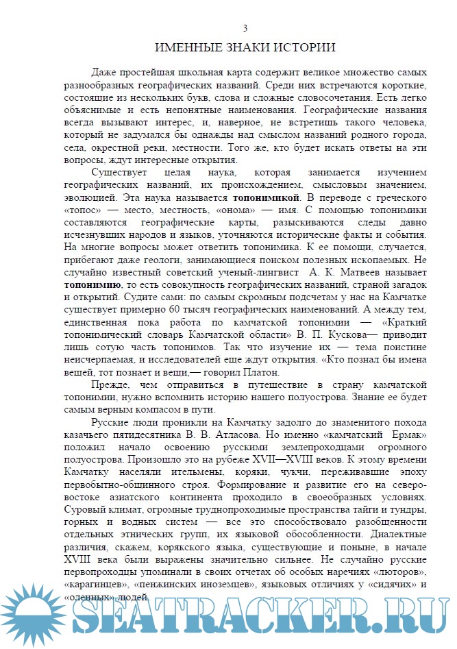 Описание: Почти тридцать лет минуло с той поры, когда вышла в свет книга «Слово на карте». Написал ее камчатский краевед В. И. Воско​бойников, наблюдательный и пытливый чело​век, впервые попытавшийся заглянуть в тай​ны камчатской топонимии. Спустя пять лет был опубликован «Краткий топонимический словарь Камчатской области» В. П. Кускова. Обе работы давно уже стали библиографиче​ской редкостью. Между тем, интерес к гео​графическим названиям Камчатки все возра​стает, и его не могут удовлетворить немногие публикации, появляющиеся в различных, к то​му же труднодоступных изданиях. В какой-то мере восполнить этот пробел поможет читате​лю предлагаемая книга. В ней рассказывается об истории географических названий и географических объектов полуострова Камчатка. Книга — своеобразное приложение к морским лоциям камчатских побережий, материалы рас​положены здесь в том же порядке. Вместе с тем эта работа адресована не только морякам, но и всем, кто интересуется топонимией полу​острова, его историей. Как и любое справоч​ное издание, книга рассчитана на выборочное чтение. Этим и объясняется необходимость повторения в отдельных очерках одних и тех же событий, имен, характеристик. Это первое издание подобного рода на Камчатке, и автор заранее благодарен читателям, которые помо​гут советами, дополнениями, уточнениями, не​обходимыми для дальнейшей работы.