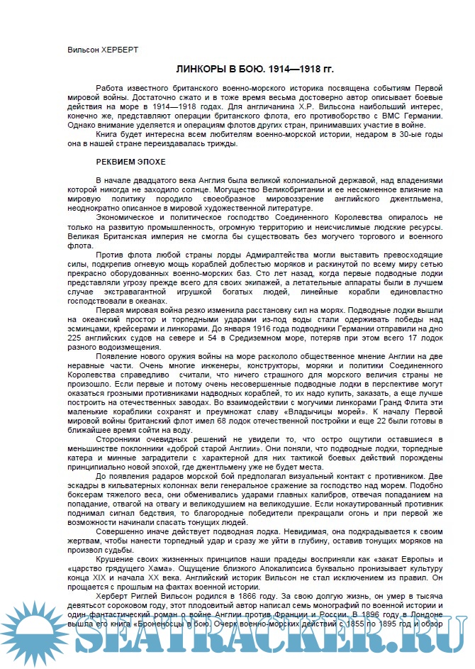 Описание: Работа известного британского военно-морского историка посвящена событиям Первой мировой войны. Достаточно сжато — в одном томе — и в тоже время весьма достоверно автор описывает боевые действия на море в 1914-1918 годах. Для англичанина Х.Р. Вильсона наибольший интерес, конечно же, представляют операции британского флота, его противоборство с ВМС Германии. Однако внимание уделяется и операциям флотов других стран, принимавших участие в войне. Книга будет интересна всем любителям военно-морской истории, недаром в тридцатые годы она в нашей стране переиздавалась трижды.