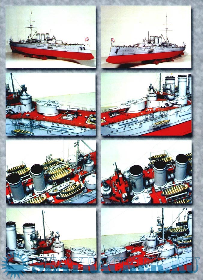 Описание: 29 листов цветных выкроек и инструкций для изготовления бумажной модели броненосного крейсера ''Рюрик'' в масштабе 1:200
