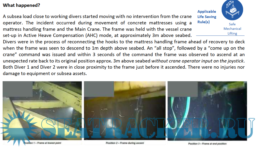 1 Unexpected Descent and Ascent of Mattress Lifting Frame 2 High potential: dropped chain assembly 3 Electrocution incident – make sure electrical equipment is safe! 4 Near miss with high pressure gas due to incorrect procedures 5 MSF: person injured falling between decks
