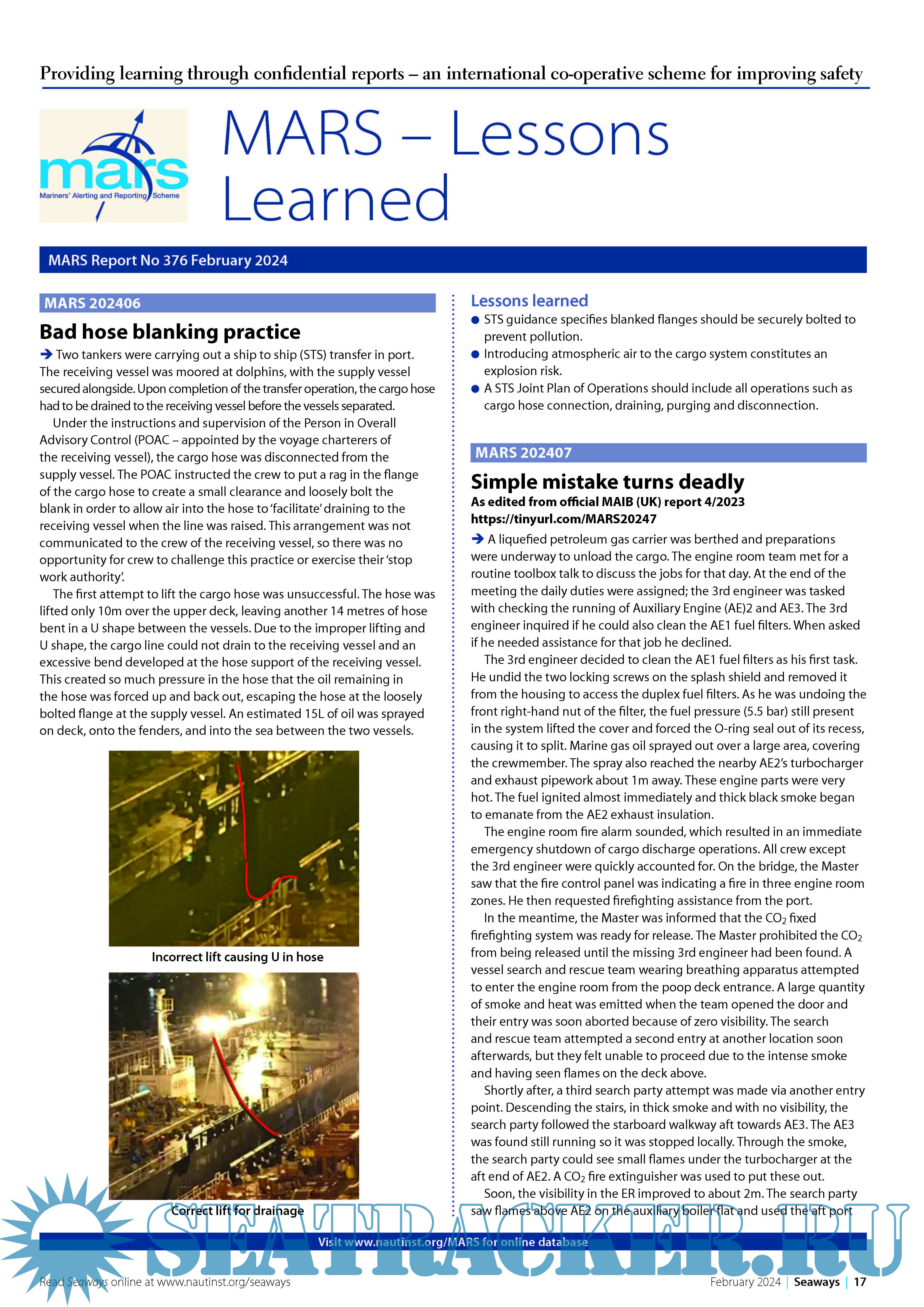 Year: 2024 Language: English Author: The Nautical Institute Genre: Periodical (magazine) Format: PDF Quality: eBook Pages count: 4 Description: MARS Report No 376 February 2024 Providing learning through confidential reports – an international co-operative scheme for improving safety.MARS is a searchable database containing reports of accidents and near misses stretching back over a quarter of a century. Funded through the generous support of the Institute's Nautical Affiliate partners, it is one of the maritime industry's leading risk reduction initiatives and is helping to make life safer for seafarers everywher.
