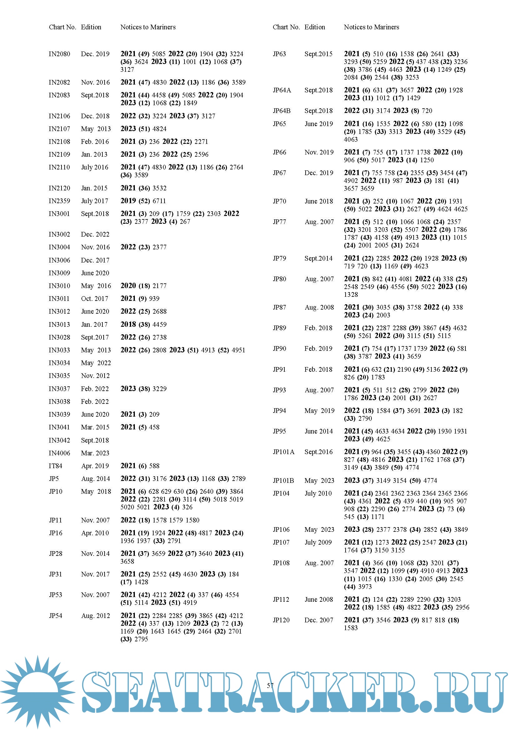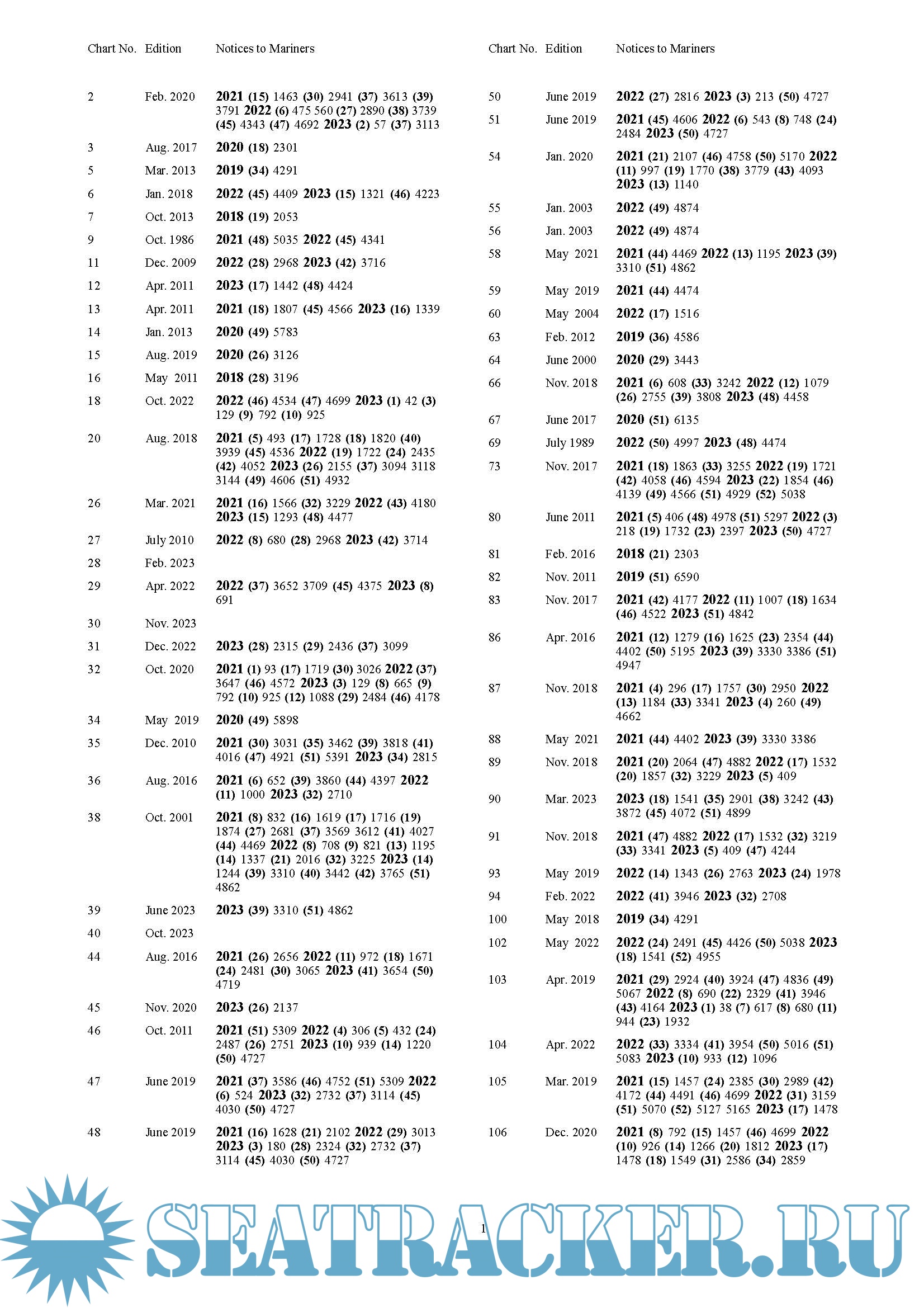 Description: The Cumulative List of ADMIRALTY Notices to Mariners (NP234 A/B) can help you to identify outstanding NMs and audit trails for a particular chart or charts. The list is published annually, with Part A in January and Part B in July.