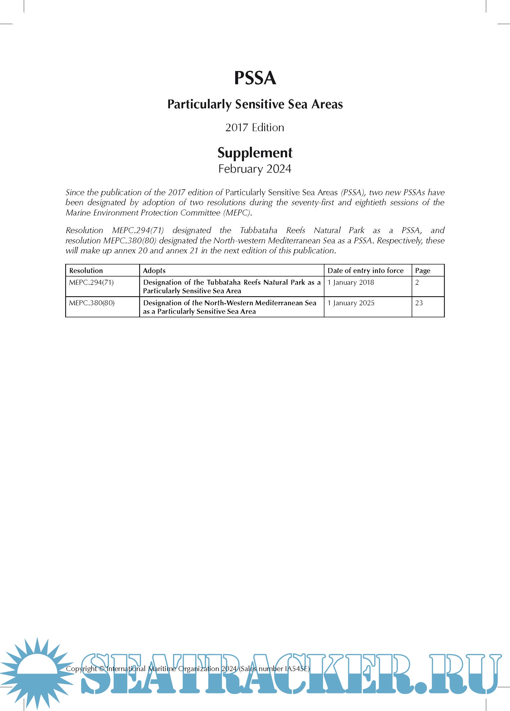 Particularly Sensitive Sea Areas (PSSA) 2017 Edition Supplement - February, 2024