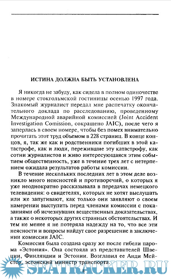 Год выпуска: 2007 Язык: русский Автор: Рабе Ютта Жанр: История Издательство: Центрполиграф Формат: PDF Качество: Изначально компьютерное (eBook) Количество страниц: 298 Описание: Загадки истории, несомненно, завораживают каждого, кто к ним прикасается. К таким тайнам относится и крушение парома "Эстония", которое произошло в ночь с 27 на 28 сентября 1994 года. В результате трагедии погибло 852, а спаслось всего 137 человек. Немецкая журналистка и продюсер Ютта Рабе провела свое расследование.