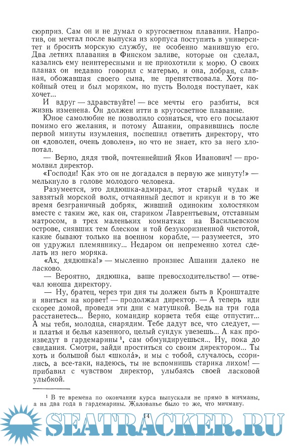 Описание: В октябре 1861 года винтовой корвет Российского Императорского флота, в экипаж которого входил и 18-летний кадет Константин Станюкович, покинул Кронштадт. Кораблю предстояло пройти моря от Балтийского до Японского; на его пути было три океана - Атлантический, Индийский, Тихий; за время путешествия моряки посетили Гамбург и Лондон, острова Мадейру и Зеленого Мыса, Батавию (Индонезию), Гонконг, Сан-Франциско, Гонолулу. Затем Константин Станюкович провел год в акватории Тихого океана на различных судах; был направлен на месяц в Сайгон, где стал невольным очевидцем самого острого момента в покорении французами Индокитая (эти впечатления легли в основу очерка «В Кохинхине»), а в сентябре 1863 года уже по суше через Китай и Сибирь вернулся в Санкт-Петербург.