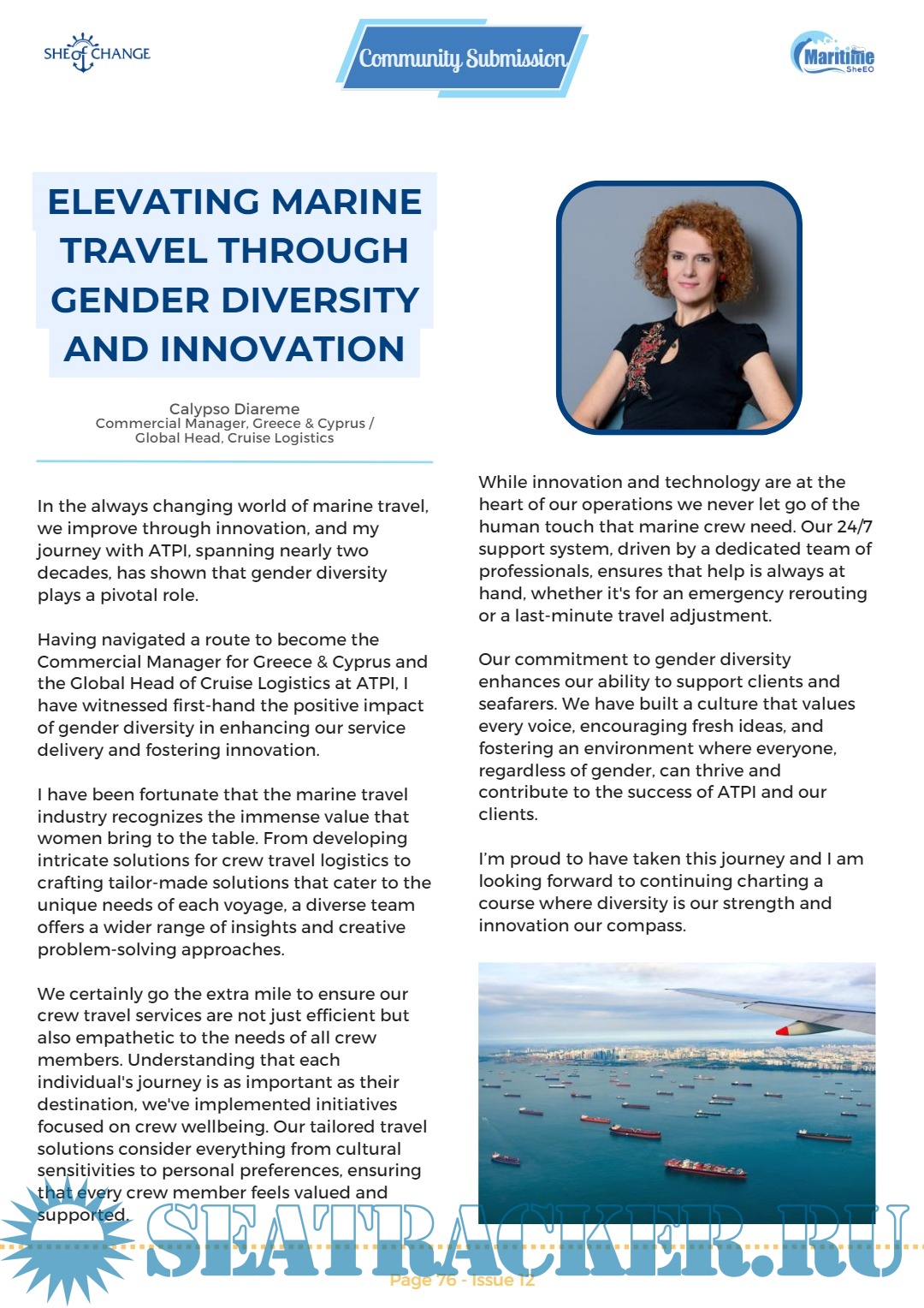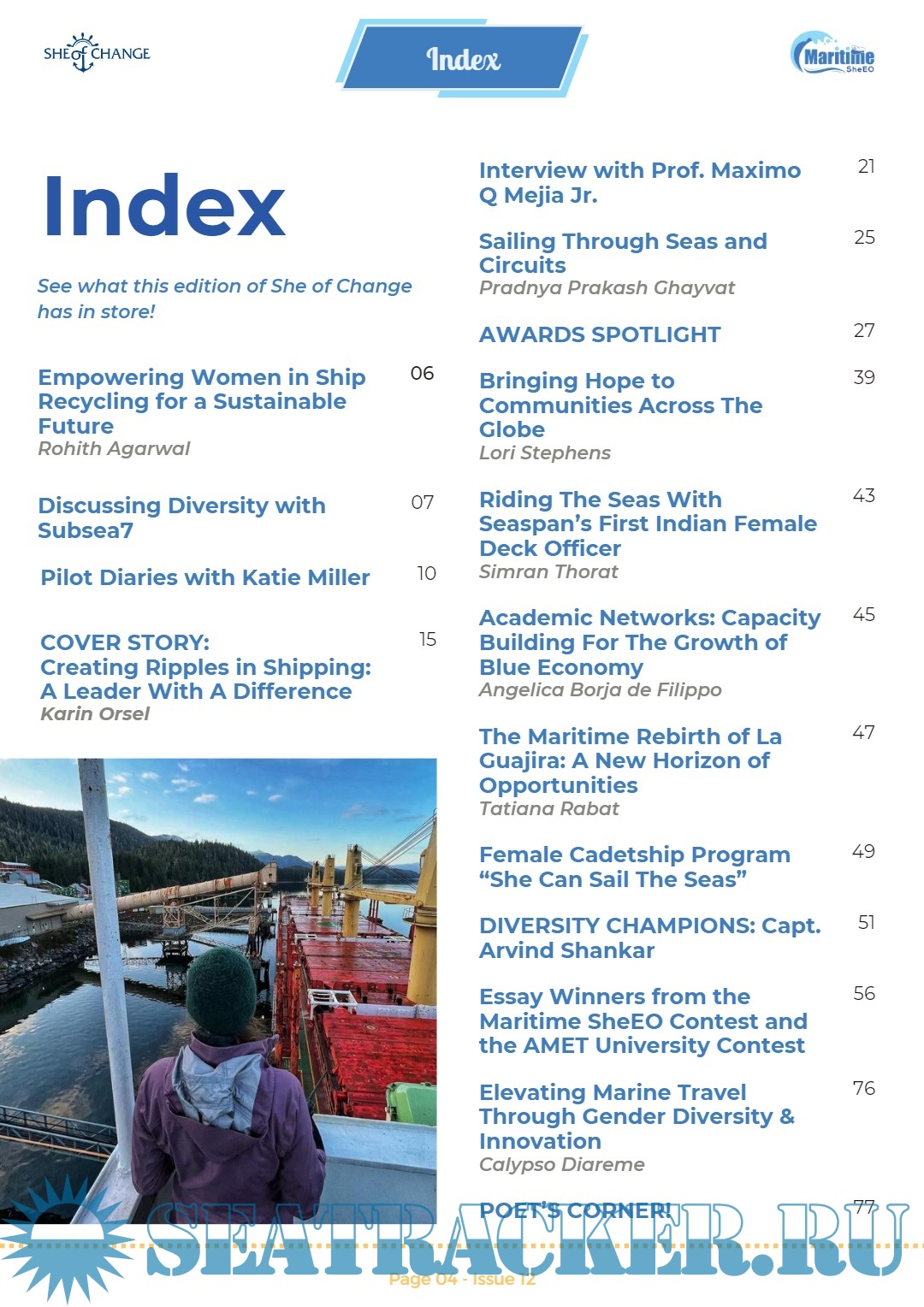 Additionally, some of the stories and interviews in this issue are focussed on shipping companies and organizations, such as SAGT, Seaspan, and Maersk—the Maritime SheEO 2023 Award winners—that showcase their best practices and policies for advancing sustainability, diversity, equality, and inclusiveness.