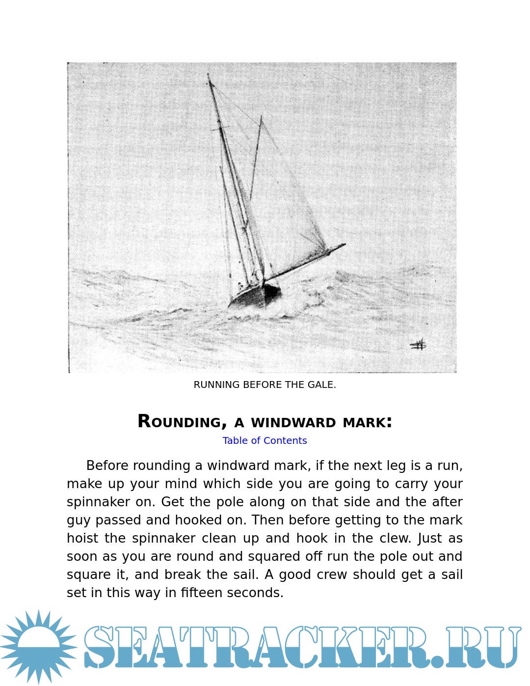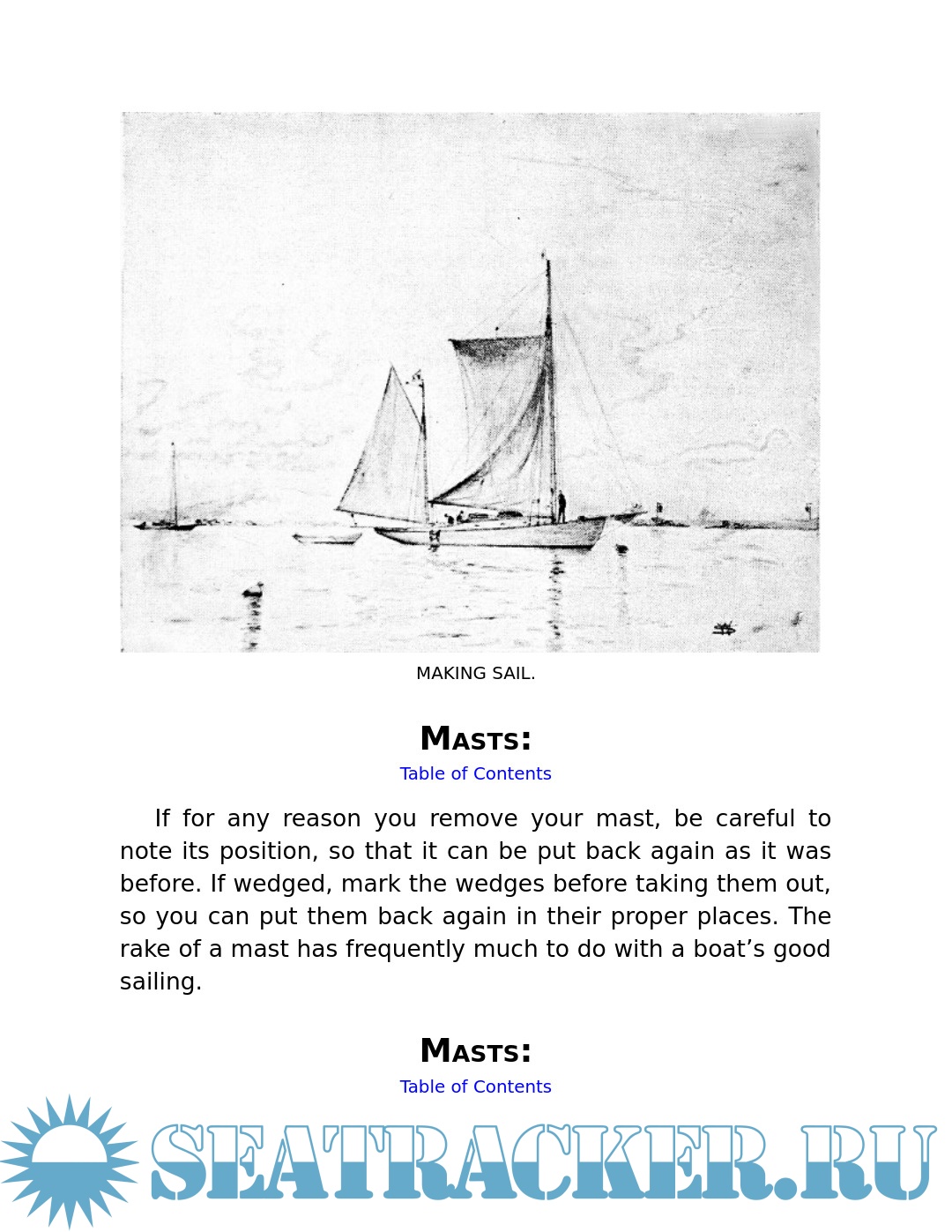 Description: In THIS book is the response to a constant appeal for information. During the last nine years I have received thousands of letters, asking for hints on all manner of subjects relating to the care, handling, buying and equipping of small yachts. The majority of these letters came from boys and young men living throughout the world, who were just entering the sport, and who were anxious to become skillful sailors and competent skippers. I can thoroughly understand their position, and sympathize with their desire for fuller and more practical knowledge than that contained in the majority of works upon yachting. What knowledge I possess of this art, or profession, I have gained by years of hard work and close observation, and having begun my studies when very young can testify to the dearth of literature of value to the green hand, who is looking for practical hints that will help him to become a skillful yacht sailor. Had I possessed a book like this, it would have saved me time, money and lots of hard work and anxiety. But, in using this book, it must be remembered that a hint is not a law or a command, it is simply a concise statement for you to take, think over, and make use of, if it appears to be logical and practical. There may be better and easier ways of doing many of these things I speak of—that is for you to find out. I am an authority only as far as my knowledge goes, and no further. The basis of my authority is my years of observation and experience; your right to confute my findings can only be based on similar premises. Unless you have tried and proved that my instructions are wrong, they are still good medicine. If a man, especially a young one, decide to go into yachting, he should also decide to learn the business of handling these craft from the keel up. It is not sufficient, as many of you think, that all that is necessary is to learn how to sail a boat about. You should know not only how to sail her, but you should know why she sails, and all about the gear and canvas used to propel her. You should learn to rig and unrig, to care for and to understand every part of her structure, both above and below decks. It is certainly a sorry spectacle to see a man sailing a yacht who cannot tie a proper knot, splice a rope, or bend a sail, and who does not know the terms used to designate parts of the structure which he essays to manage. If he is ashamed to learn, or if he is too lazy to gather such knowledge, he is out a place in a sport which is the life and joy of energetic, skillful and brave men. I hope all of my boys the world over who are coming into yachting, and to assist whom I have written these words, will never be ashamed to learn the sailor’s trade, or be too lazy to acquire all possible knowledge relating to the art of handling vessels. You will never regret having given your time to the study. It will bring to you that which is more valuable than the treasures of the earth; something that you can never be deprived of, no matter how unlucky or how unfortunate you may be—the respect paid to the skillful by the unskillful; the deference shown to the educated by the ignorant. It is as well to say here that these hints are not intended for men owning and sailing large yachts. Such vessels are too costly to be trusted in the hands of any men except those who are thoroughly competent; and if an owner has not sufficient skill to handle a large yacht it is his business to hire somebody who has. These hints are intended for the small-boat owner and skipper.