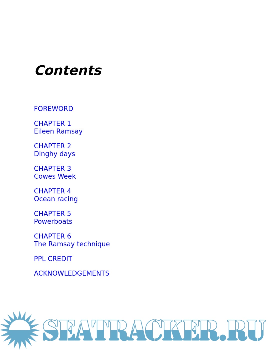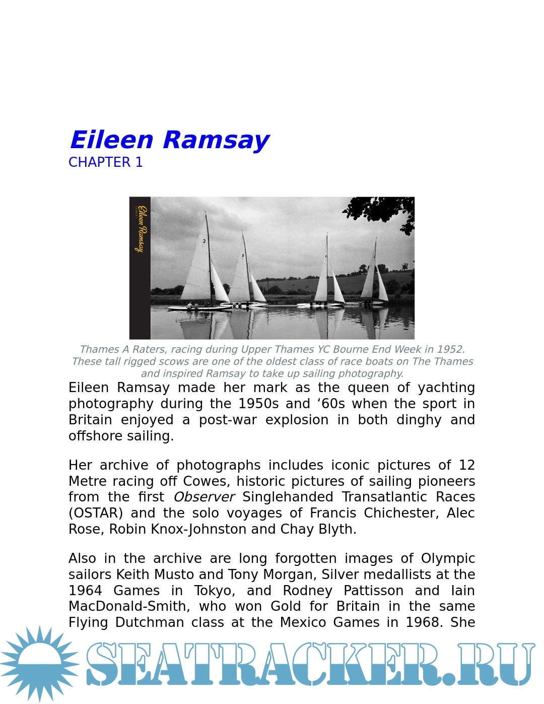 Year: 2012 Language: English Author: Pickthall B. Genre: History Publisher: Bloomsbury Publishing Plc Format: PDF/EPUB Quality: eBook Pages count: 166 Description: Eileen Ramsay was at the centre of a unique period in yachting history, and this wonderful book, featuring her classic photography, celebrates an extraordinary woman and her extraordinary subjects.Eileen's heyday was between 1957 and 1970 - a time when eccentrics ruled, records were there for the setting, and women weren't often to be found behind the lens. But Eileen established herself as one of the greatest yachting photographers of her time, taking famous portraits of such sailing icons as Sir Francis Chichester, Eric Tabarly, Olympians including Rodney Pattisson and Keith Musto, and historic pictures from the first OSTAR (Observer Single-handed Trans-Atlantic Race). She was the only photographer Chichester allowed on his Gypsy Moth yachts, and managed to photograph the notorious charmers Uffa Fox and Max Aitken.Her unique archive records the explosive growth in dinghy and offshore sailing during the post-war years, and includes pictures of the first Enterprises, Mirrors, Ospreys, Optimists and the first America's Cup 12 metres Sceptre and Evaine. This beautiful book will feature: - the post-war explosion in dinghy sailing - the growth of offshore racing - the pioneering days of the OSTAR race and solo circumnavigations - the 12 metre class and the America's Cup - post-war powerboat racingThere are also wonderful personal tributes to Eileen throughout by sailing personalities such as Vernon Stratton, Keith Musto and Uffa Fox.