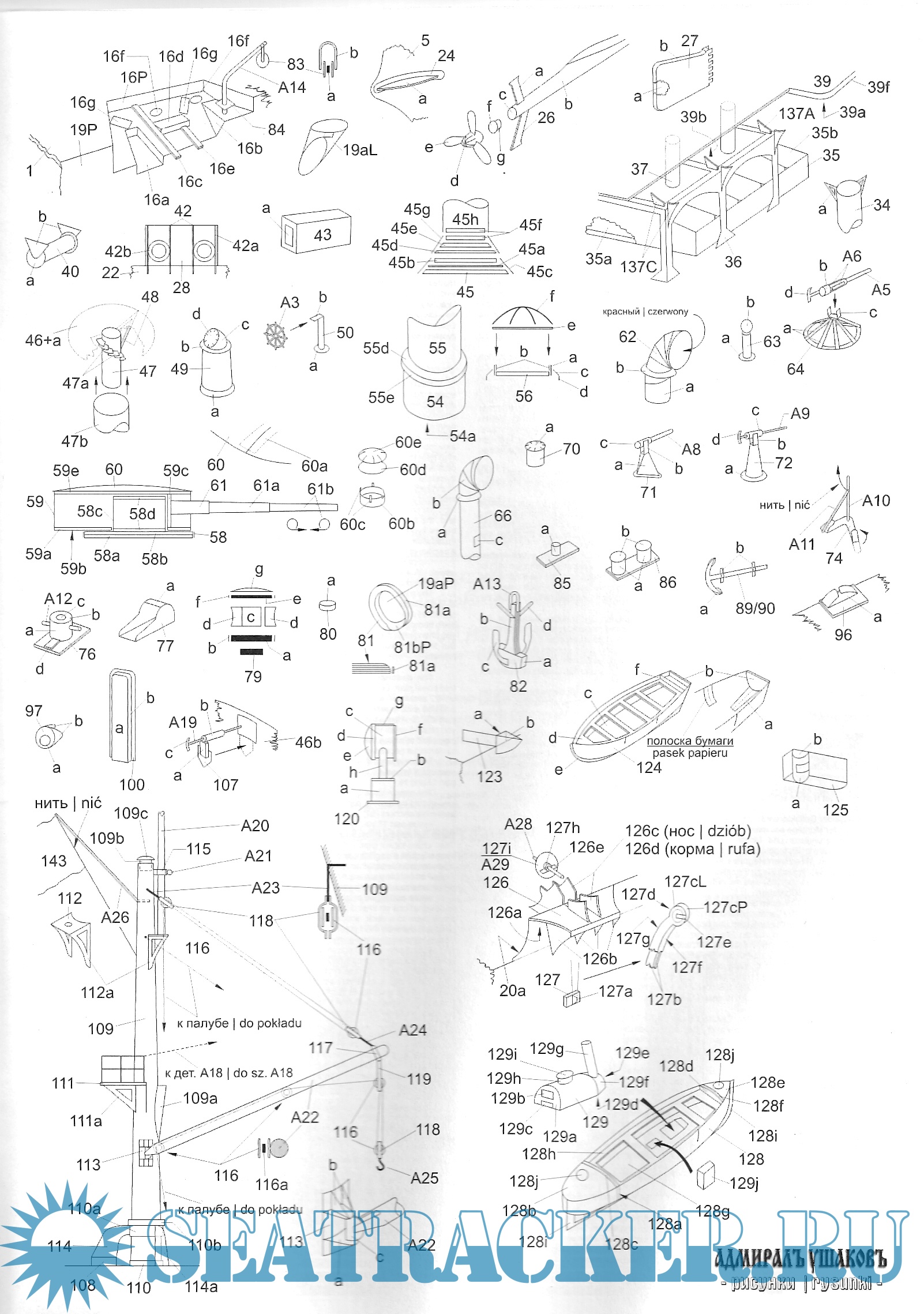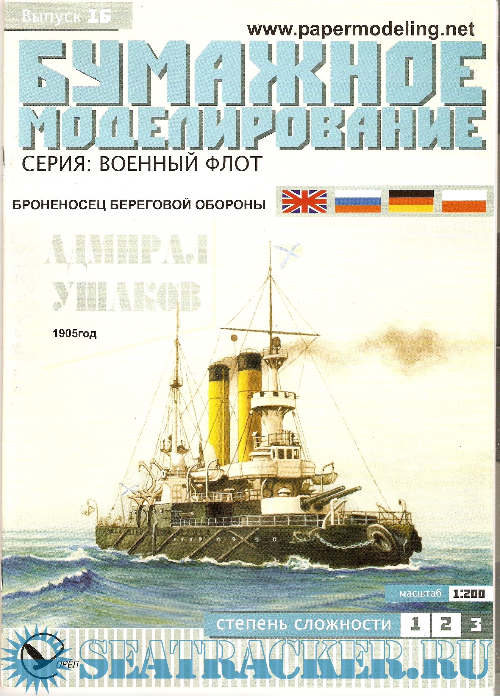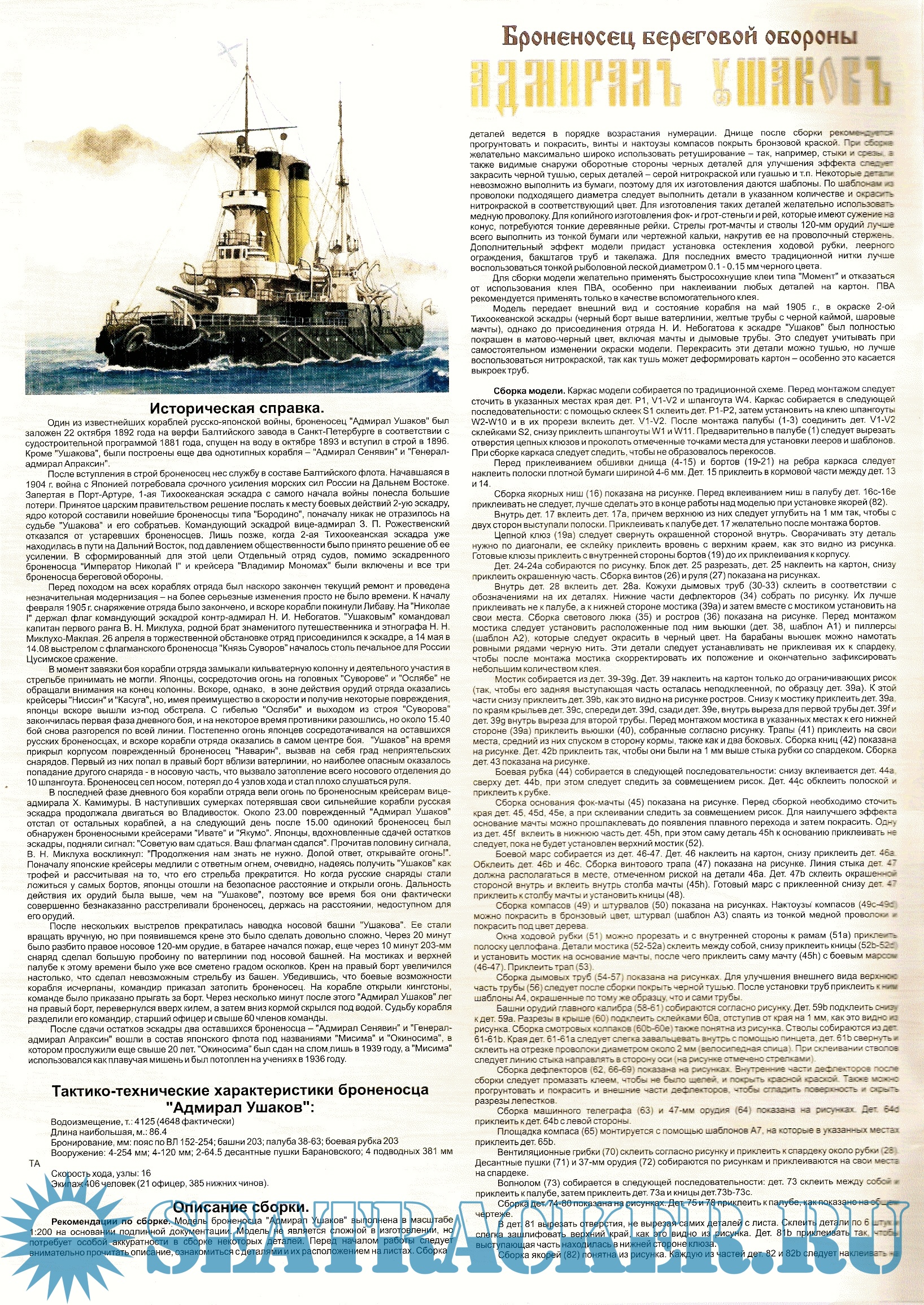 15 листов цветных выкроек и инструкций для изготовления бумажной модели броненосца береговой обороны ''Ушаков'' 1905 год (Россия) в масштабе 1:200