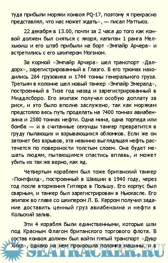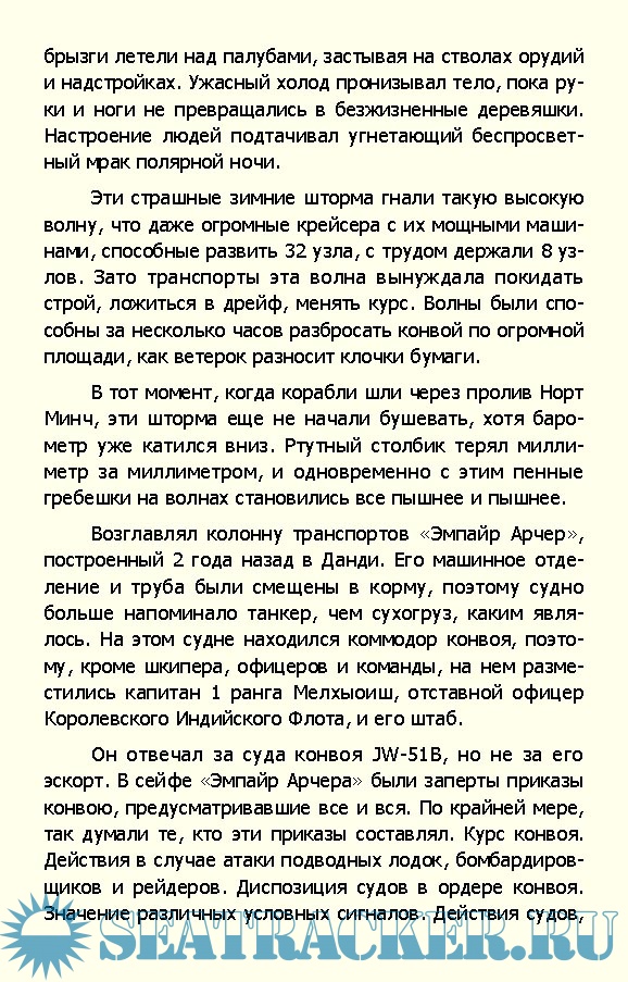 Содержание Глава 1. «Зеленый маршрут» [14] Глава 2. Главнокомандующий [26] Глава 3. «Поле судьбы» [39] Глава 4. Вопреки поражениям [50] Глава 5. Проблема [63] Глава 6. Беспокойное время [68] Глава 7. «Лично командиру» [81] Глава 8. Сочельник, 1942 год [96] Глава 9. Якорь панер [103] Глава 10. Гонка начинается [116] Глава 11. Большие кучи металлолома [135] Глава 12. Действовать осторожно [150] Глава 13. Боевая тревога [156] Глава 14. «Хиппер» атакует [172] Глава 15. «Онслоу» поврежден [188] Глава 16. Последняя радиограмма [205] Глава 17. Появляется «Лютцов» [213] Глава 18. Пли... Пли... Пли...! [227] Глава 19. Появляется «Лютцов» [249] Глава 20. «Акейтес» сражается за жизнь [261] Глава 21. Жены ждут [276] Глава 22. Томительная ночь [283] Глава 23. Шербрук, кавалер Креста Виктории [303] Глава 24. Бескровная победа [316] Глава 25. Жатва Гитлера [331] Приложения [335] Примечания Список иллюстраций