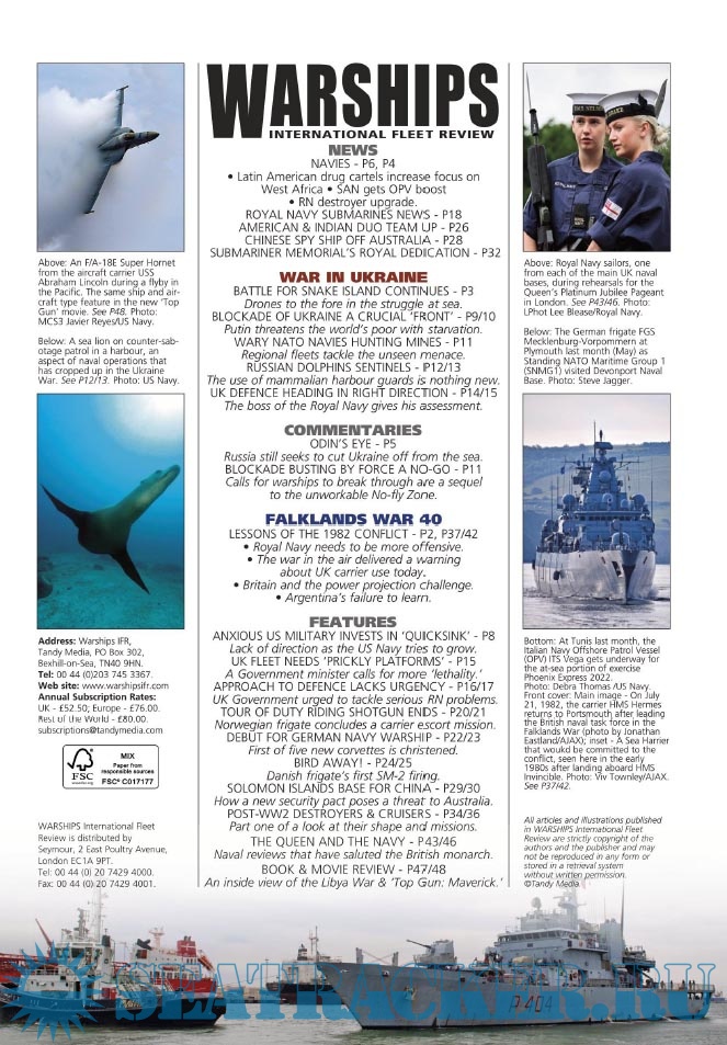 Year: 2022 Language: English Author: Iain Ballantyne (Editor) Genre: Periodical (magazine) Edition: 2022-07 Format: PDF Quality: eBook Pages count: 52 Description: Warships IFR puts the spotlight on the latest developments in the world’s navies. It covers current defence issues and has comments by leading analysts. The magazine regularly includes features on the Royal Navy and the US Navy in addition to incorporating news and features on all other navies across the globe. Warships IFR frequently carries in-depth articles on naval heritage.WARSHIPS International Fleet Review is published 12 times a year by Tandy Media Ltd who also publish Shipping Today & Yesterday (which provides news and features from the world of merchant shipping).