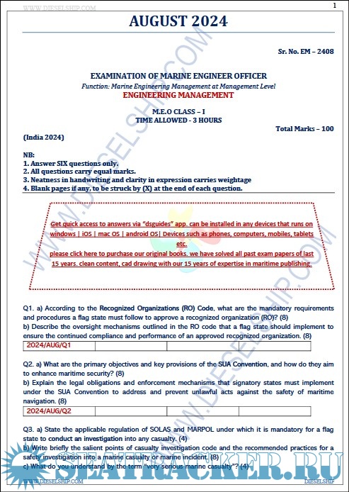 Year: 2024 Language: English Author: Dieselship Format: PDF Quality: eBook Pages count: 159 Description: M.E.O. Class I Question Paper set for Mercantile Marine Department (MMD), D.G. Shipping India Exams.