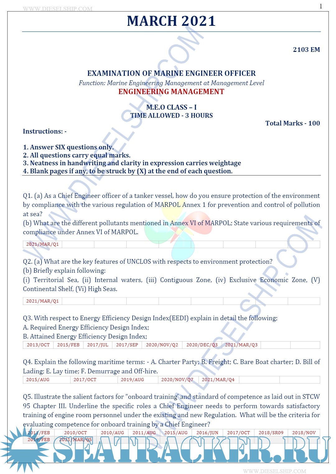 Description: M.E.O. Class I Question Paper set for Mercantile Marine Department (MMD), D.G. Shipping India Exams.