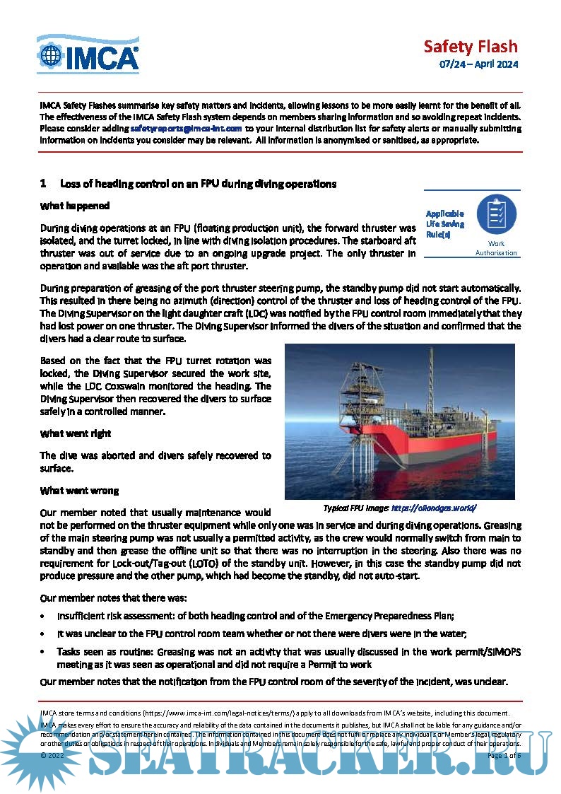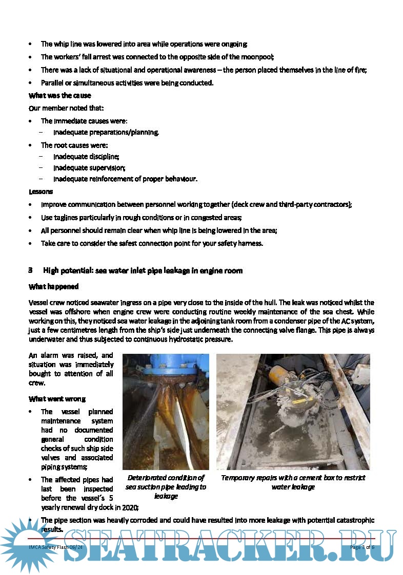 IMCA SF 06/24 Person struck and injured during lifting operations Person pulled to deck by fall arrest harness High potential: sea water inlet pipe leakage in engine room Security: Illegal boarding - theft while the vessel at anchor MSF: Chemical Handling – Eye Burn IMCA SF 07/24 Loss of heading control on an FPU during diving operations Implosion of chemical tank USCG: hazard from discarded munitions Person injured when chain hoist container failed at securing point LTI: person slipped climbing out of tank