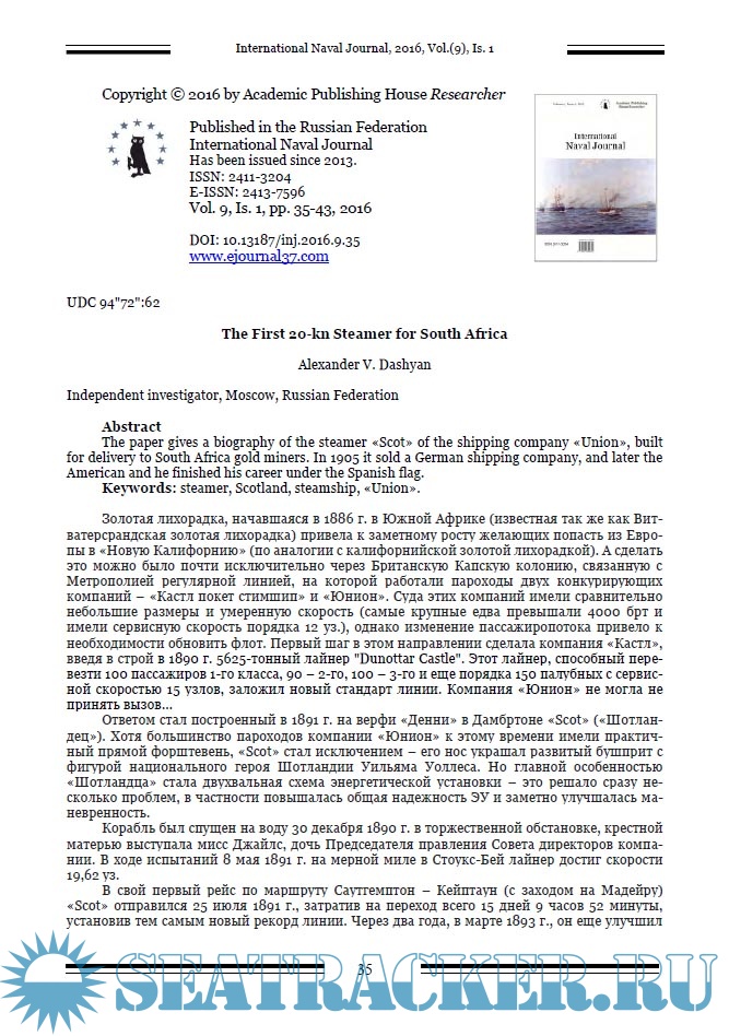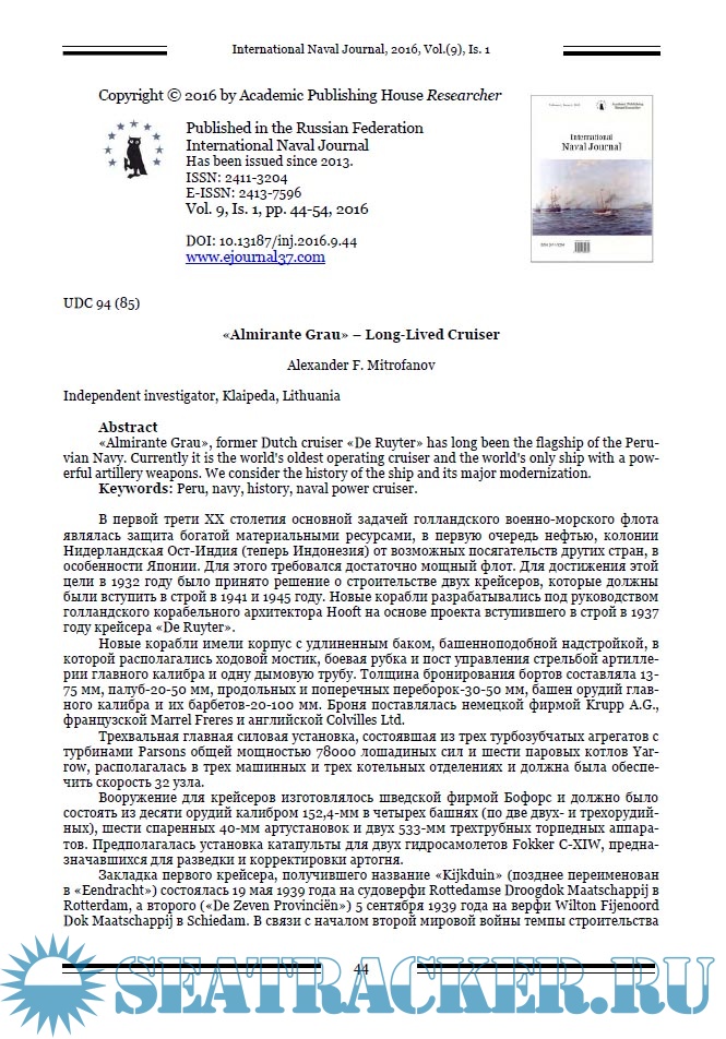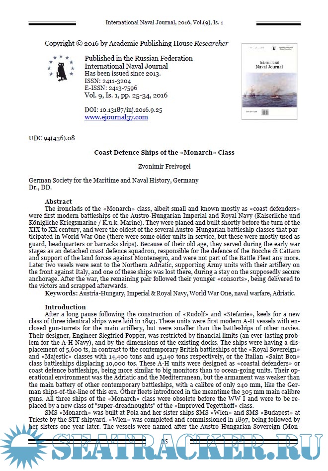 Описание: Миссия журнала заключается в создании международной дискуссионной платформы в области военно-морской истории. В отличие от большинства авторитетных военно-морских исторических журналов, мы позиционируем себя в первую очередь как один из немногих научных журналов в этой области, что предполагает необходимые требования к структурированию работы, ее метаданным, библиографическому описанию, а также процедуре рецензирования.Журнал публикует материалы, статьи и краткие сообщения о результатах исследований в области военно-морской истории, на английском и русском языках. Выходные данные статьи на английском языке.