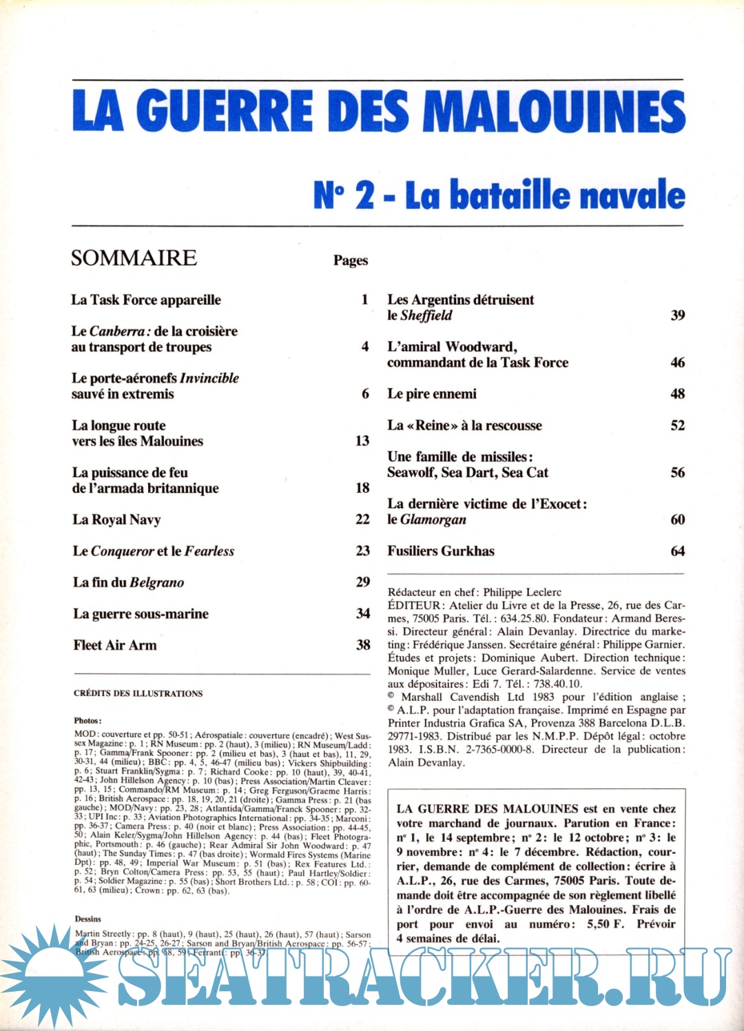Description: La Guerre des Malouines est en vente chez votre marchand de journaux. Parution en France: nº 1 , le 14 septembre; nº 2: le 12 octobre; nº 3: le 9 novembre: nº 4: le 7 décembre. Rédaction, courrier, demande de complément de collection: écrire à A.L.P., 26, rue des Carmes, 75005 Paris. Toute demande doit être accompagnée de son règlement libellé à l'ordre de A.L.P.-Guerre des Malouines. Frais de port pour envoi au numéro: 5,50 F. Prévoir 4 semaines de délai.