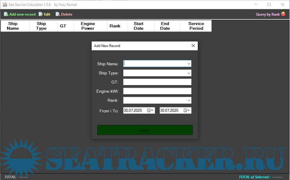 Year: 2025 Version: 1.5.6 Developer: Yury Komar Platform: Windows 64-bit OS compatibility: yes Localization: English Crack: Not needed Description: Keep records of sea work experience on the ships. • Displays the total duration of service for the entire period (whole list), as well as separately by rank\position. • The calculation of the duration of service is carried out according to the accepted rules for keeping sea service certificates. • Allow Sorting records by click on Column header • App keep your sorting saved and reload it while opening Additional info: Made with ❤ in Vladivostok. Please support the project:http://sea-soft.ru/donate.html If any application from Sea-Soft Project has helped you with routine job or simplifying any other tasks, consider supporting its continued development with a small donation! ???? Any donations large or small are greatly appreciated :) A massive THANK YOU to everyone who's already donated and supported the coding! ☕️ Donate (https://t.me/tribute/app?startapp=deT5) (EUR via Telegram) Donate (https://boosty.to/sea-soft/donate) (Any via Boosty) Donate (https://www.sberbank.com/sms/pb...ber=79140787339) (RUB via Sber) (https://t.me/SeaSoft_by_YuryKomar/24/3558)