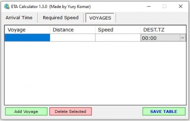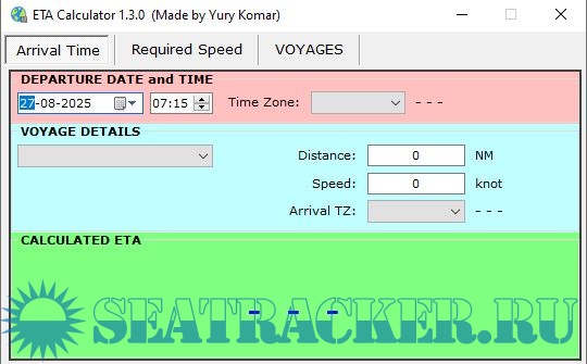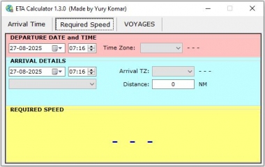 Year: 2025 Version: 1.3.0 Developer: Yury Komar Platform: Windows Localization: English Crack: Not needed Description: Calculates an estimated time of arrival (ETA) Calculates the vessel's speed required to arrive in set time For your convenience it is possible to fill the table with basic route details and switch between them by selection one in drop-down menu Changelog:1.3.0 Calculates an estimated time of arrival (ETA) Calculates the vessel's speed required to arrive in set time Showing required time to go For your convenience, it is designed to pre-fill the voyages in table with basic route details and quickly switch between them by selection one in drop-down menu App calculates ETA correctly taking into account both Time Zones Online ETA Calculator v2.0.4: It was made in collaboration with @mishabar Also was created a stable Android application which is available for downloading from http://sea-soft.ru Android app works offline, just install it and you are free to use it and share with others. Hope it will be useful for all to calculate on the go...http://sea-soft.ru/Downloads/ETA_Online.html#eta Calculation approach in the Android and online tools made almost the same as Windows Software. Android application: