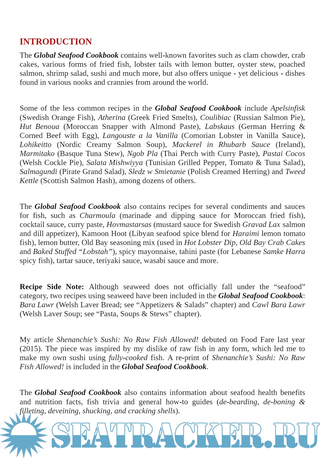 Some of the less common recipes in the Global Seafood Cookbook include Apelsinfisk (Swedish Orange Fish), Atherina (Greek Fried Smelts), Coulibiac (Russian Salmon Pie), Hut Benoua (Moroccan Snapper with Almond Paste), Labskaus (German Herring & Corned Beef with Egg), Langouste a la Vanilla (Comorian Lobster in Vanilla Sauce), Lohikeitto (Nordic Creamy Salmon Soup), Mackerel in Rhubarb Sauce (Ireland), Marmitako (Basque Tuna Stew), Ngob Pla (Thai Perch with Curry Paste), Pastai Cocos (Welsh Cockle Pie), Salata Mishwiyya (Tunisian Grilled Pepper, Tomato & Tuna Salad), Salmagundi (Pirate Grand Salad), Sledz w Smietanie (Polish Creamed Herring) and Tweed Kettle (Scottish Salmon Hash), among dozens of others.