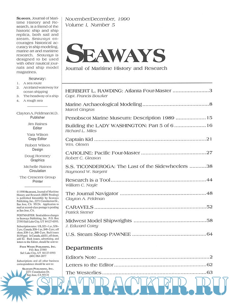 Year: 1990 Language: English Author: Scottie Dayton (Editor) Genre: Periodical (magazine) Format: JPEG Quality: Scanned pages Pages count: 76 Description: Seaway is the home port for Seaways Ships in Scale magazine, the leading workshop and research magazine for the ship modeler. In the magazine we explore all levels of modeling experience, all types of ships, all kinds of models, all historical eras and all construction materials