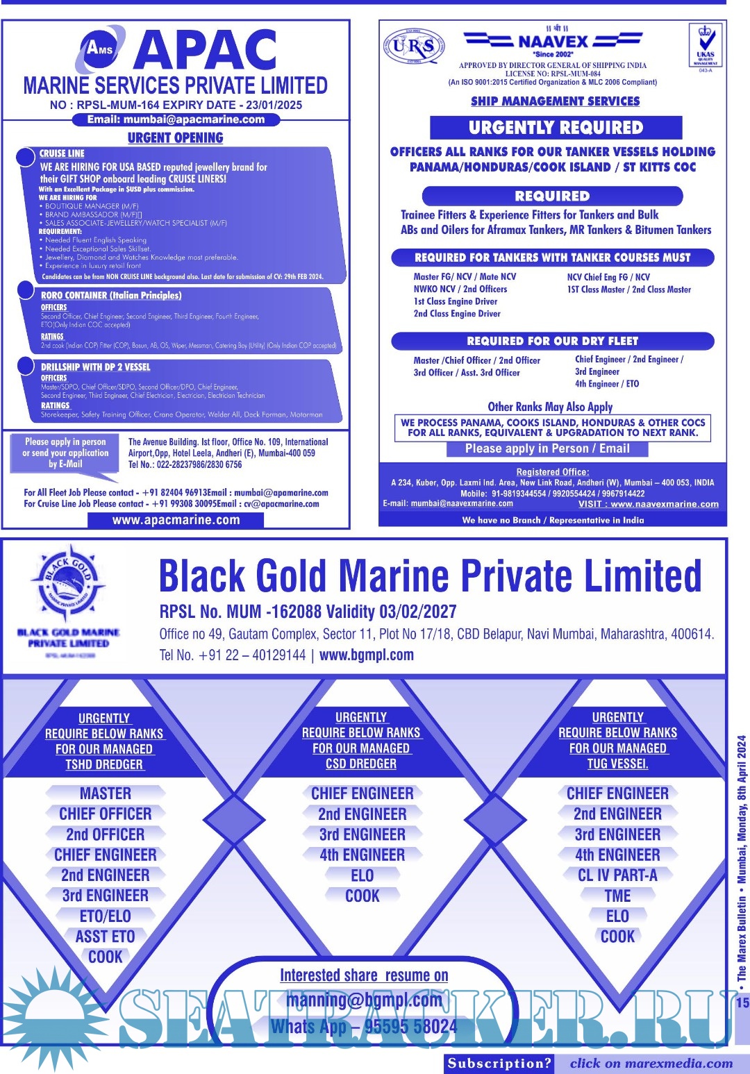 Description: The No 1 Twice weekly employment magazine for Seafarers.The Leading magazine for seafarers to locate Ship-board Employment opportunities, Training Institutes, Shipping companies.Online version: https://issuu.com/marexmediapvtltd Contents
