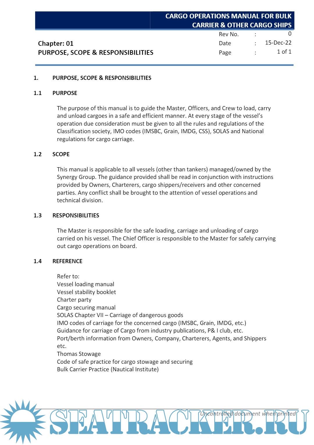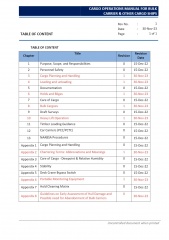 Description: The purpose of this manual is to guide the Master, Officers, and Crew to load, carry and unload cargoes in a safe and efficient manner. At every stage of the vessel’s operation due consideration must be given to all the rules and regulations of the Classification society, IMO codes (IMSBC, Grain, IMDG, CSS), SOLAS and National regulations for cargo carriage.