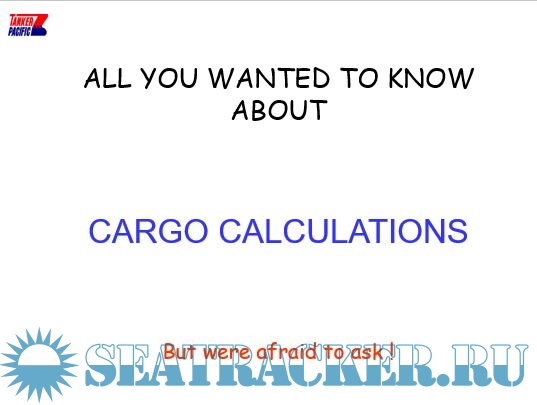 Year: 19xx Language: English Author: Tanker Pacific Genre: Presentation Format: PPT Quality: eBook Pages count: 35 Description: All you wanted to know about Cargo Calculations But were afraid to ask ! Presentation by Tanker Pacific.