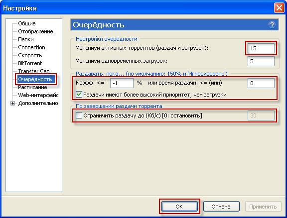 4. Далее в этом же окне на вкладке "Очередность": - в группе "Максимум активных торрентов (раздач и загрузок)" указываем значение 15 или больше; - в группе "Раздавать, пока..." в поле "Коэфф. <=" указываем значение "-1" (без кавычек), после чего устанавливаем флажок "Раздачи имеют более высокий приоритет, чем загрузки"; - в группе "По завершению раздачи торрента" снимаем флажок "Ограничить раздачу до (Кб/с)". По окончанию настройки нажимаем