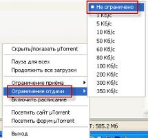 1. Сначала выключаем ограничение на максимальную скорость раздачи. Для этого при помощи правой кнопки мыши щелкаем по значку uTorrent в виде темно-зеленого квадратика, затем в выпадающем меню выбираем пункты "Ограничение отдачи->Не ограничено".