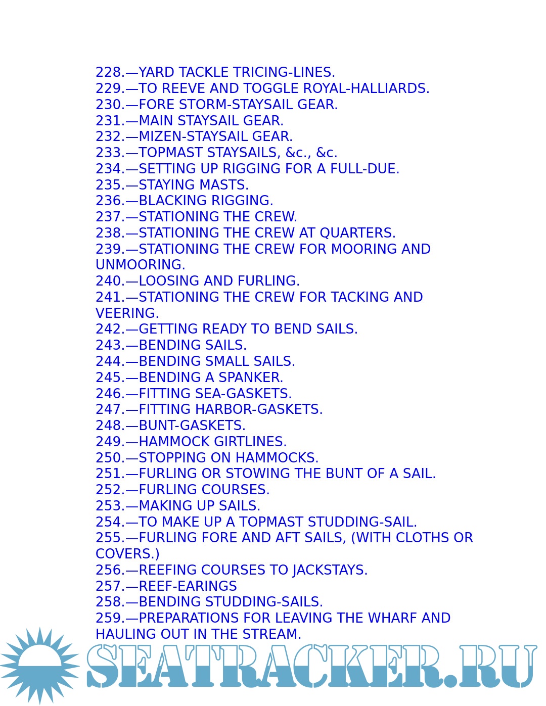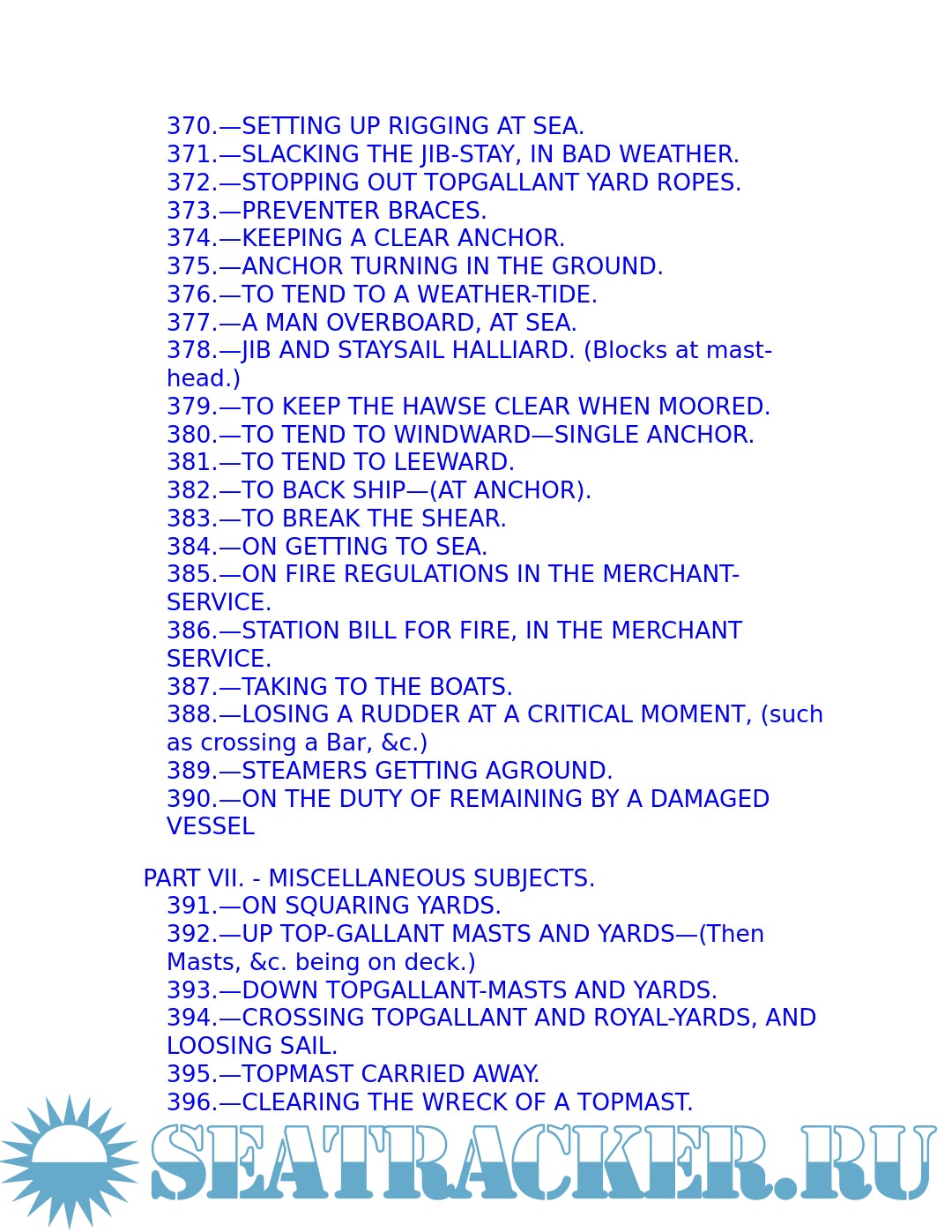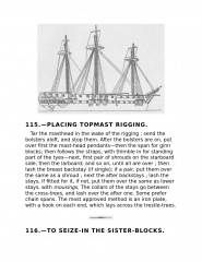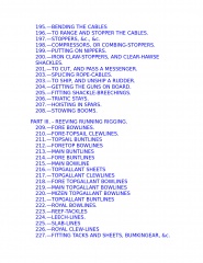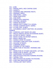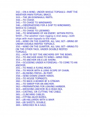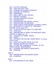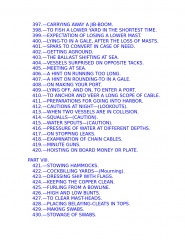 The young sailor learns about stowing provisions, driving before the wind. Securing the ship for sea, and setting and shifting course. He also learns what to do in the extremities of life at sea: how to unbend a topsail in a gate and how to prepare for a hurricane; what to do if the tiller breaks, the mainmast is carried away, or the ship leaks faster than the pumps can free her. Detailed instructions explain procedures for dealing with fires, squalls, and waterspouts, what to do when the main rigging is shot away by an enemy or when a man has fallen overboard, and how to abandon ship and take to the boats when necessary.