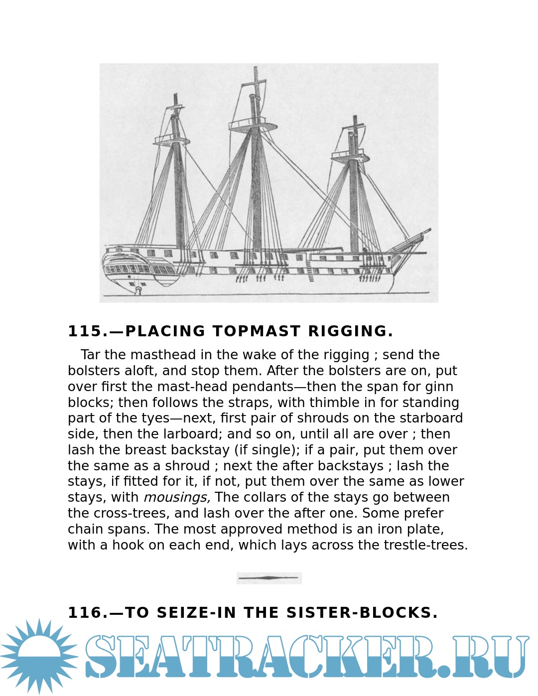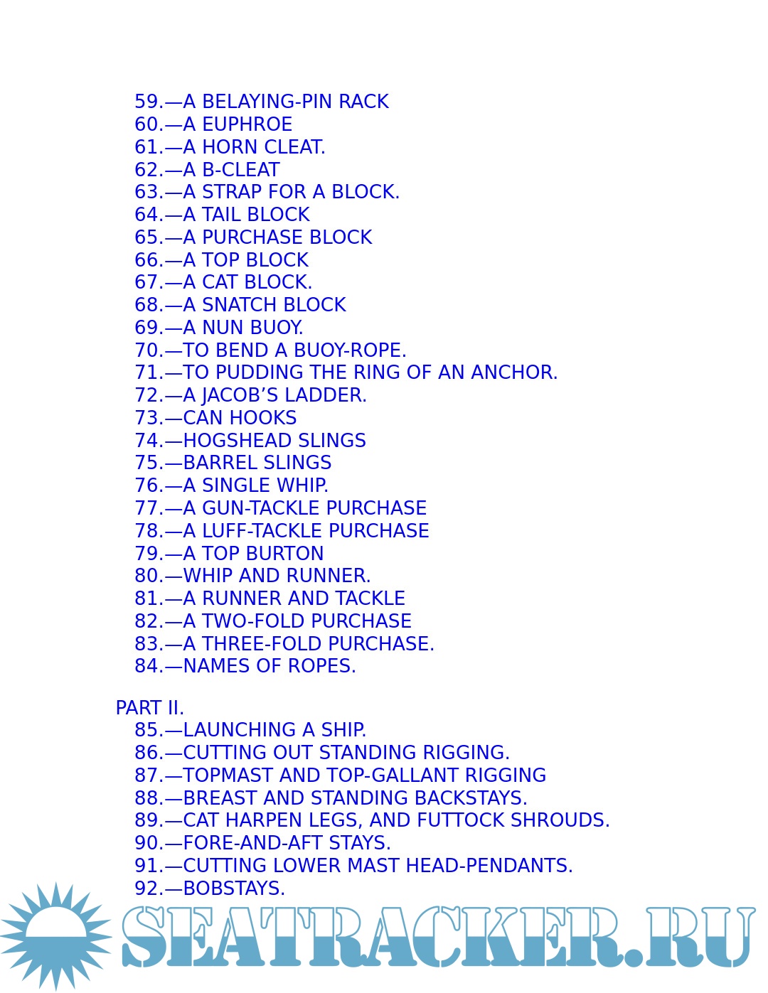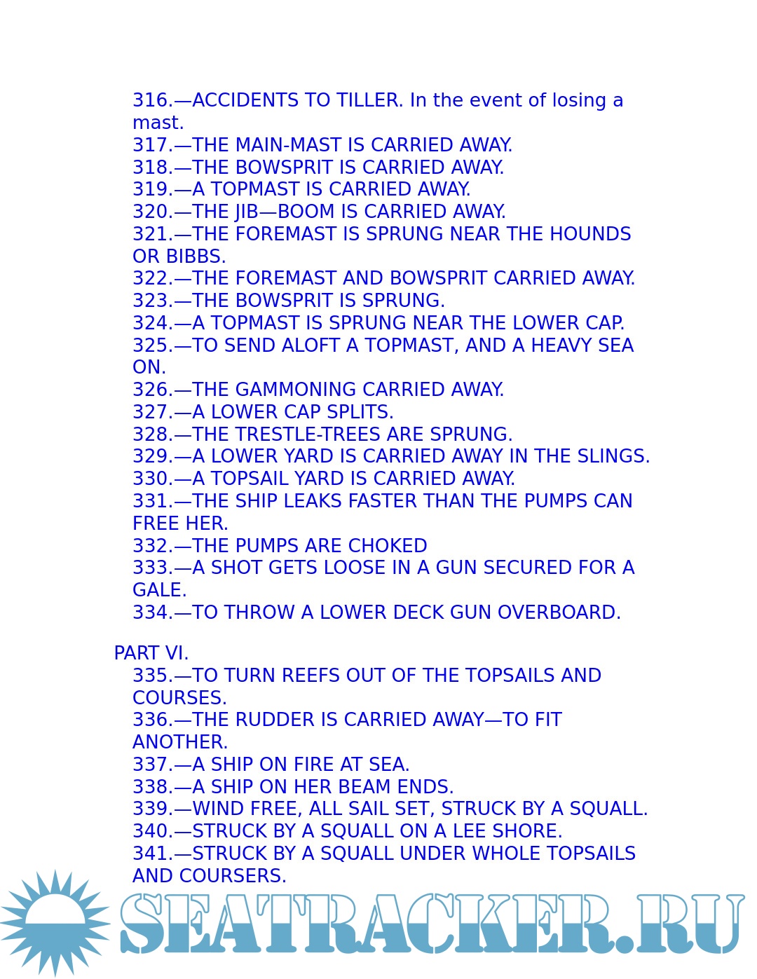 The young sailor learns about stowing provisions, driving before the wind. Securing the ship for sea, and setting and shifting course. He also learns what to do in the extremities of life at sea: how to unbend a topsail in a gate and how to prepare for a hurricane; what to do if the tiller breaks, the mainmast is carried away, or the ship leaks faster than the pumps can free her. Detailed instructions explain procedures for dealing with fires, squalls, and waterspouts, what to do when the main rigging is shot away by an enemy or when a man has fallen overboard, and how to abandon ship and take to the boats when necessary.