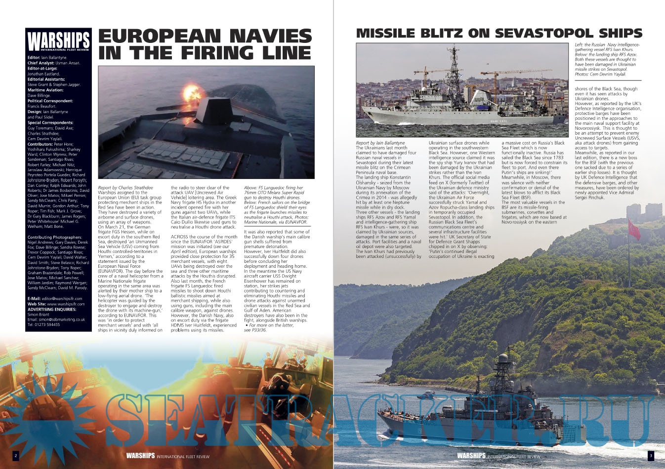 Description: Warships IFR puts the spotlight on the latest developments in the world’s navies. It covers current defence issues and has comments by leading analysts. The magazine regularly includes features on the Royal Navy and the US Navy in addition to incorporating news and features on all other navies across the globe. Warships IFR frequently carries in-depth articles on naval heritage.WARSHIPS International Fleet Review is published 12 times a year by Tandy Media Ltd who also publish Shipping Today & Yesterday (which provides news and features from the world of merchant shipping).