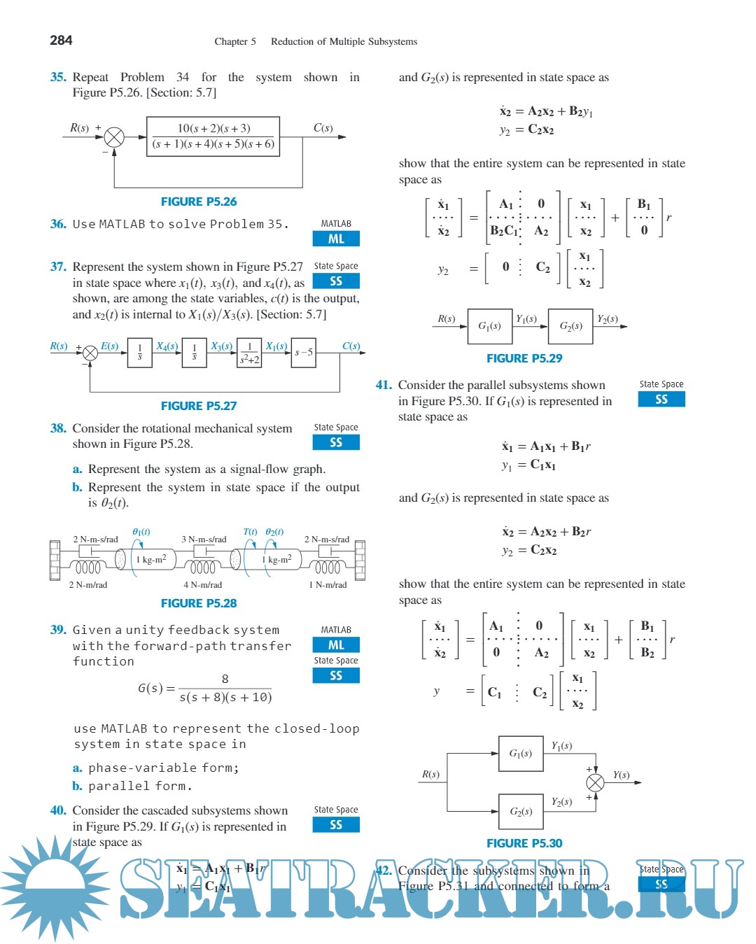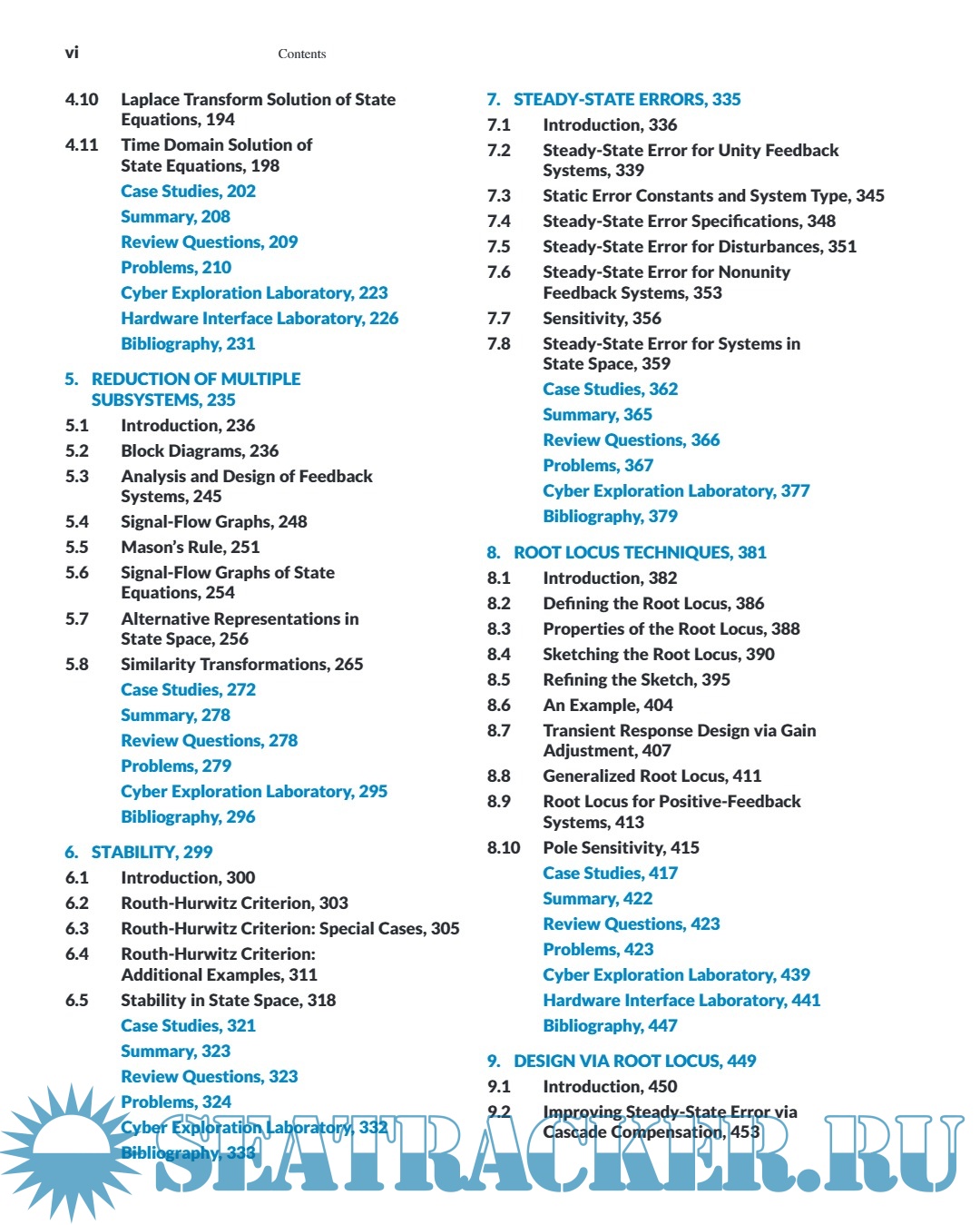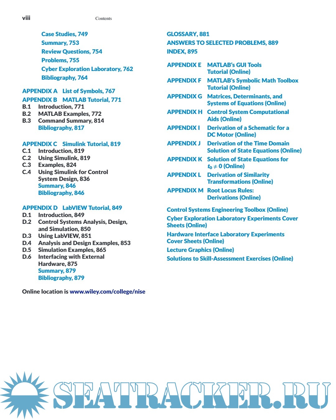 Year: 2015 Language: English Author: Norman S. Nise Genre: Reference book ISBN: 978-1-118-17051-9, 978-1-118-80082-9 Format: PDF Quality: eBook Pages count: 943 Description: This book introduces students to the theory and practice of control systems engineering. The text emphasizes the practical application of the subject to the analysis and design of feedback systems. The study of control systems engineering is essential for students pursuing degrees in electrical, mechanical, aerospace, biomedical, or chemical engineering. Control systems are found in a broad range of applications within these disciplines, from aircraft and spacecraft to robots and process control systems. Control Systems Engineering is suitable for upper-division college and university engineering students and for those who wish to master the subject matter through self-study. The student using this text should have completed typical lower-division courses in physics and mathematics through differential equations. Other required background material, including Laplace transforms and linear algebra, is incorporated in the text, either within chapter discussions or separately in the appendixes or on the book's Companion Web site. This review material can be omitted without loss of continuity if the student does not require it.