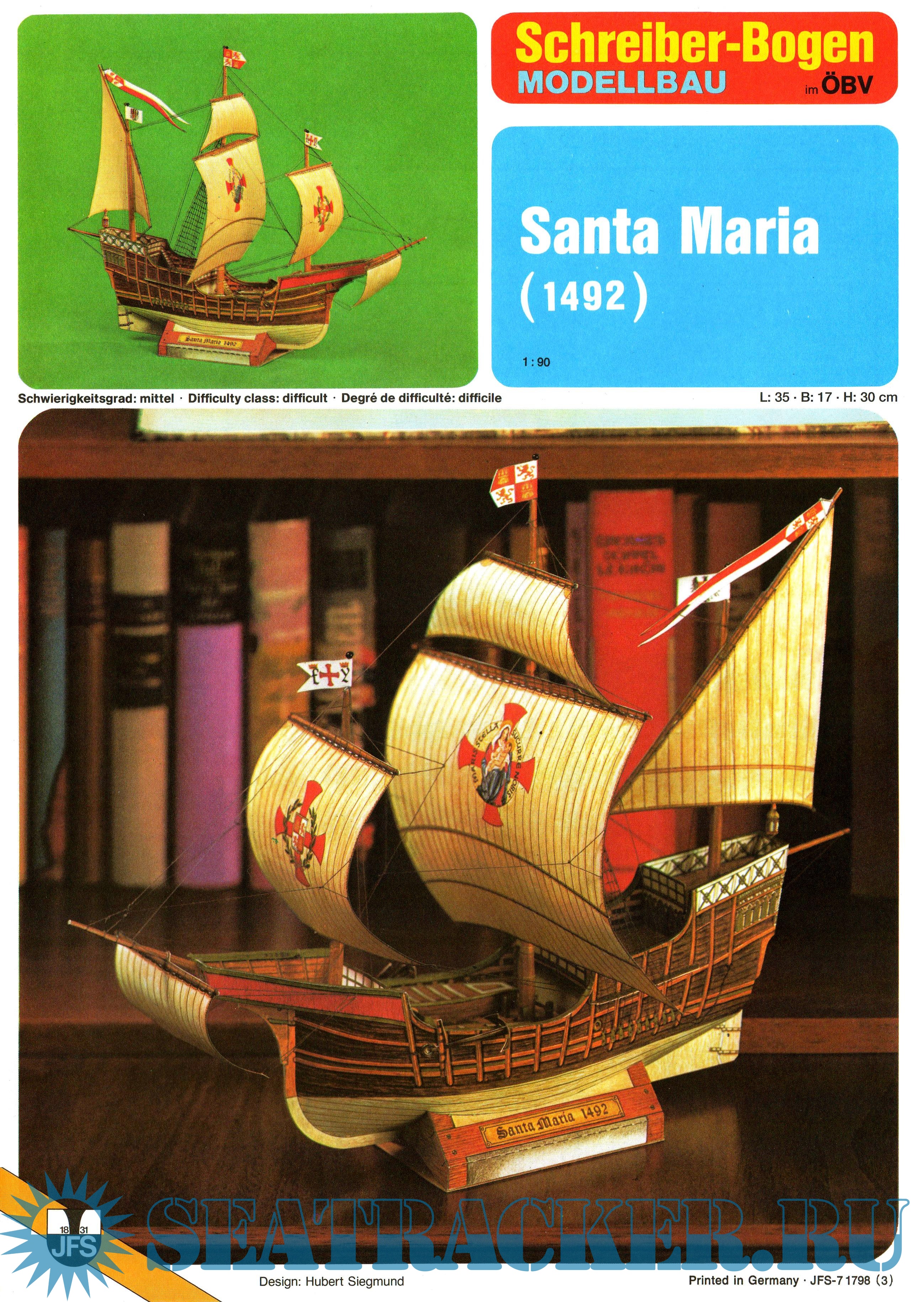 Год выпуска: 2009 Язык: Мультиязычный Автор: Hubert Siegmund Жанр: Другое Издательство: Schreiber-Bogen Формат: JPEG Качество: Изначально компьютерное (eBook) Количество страниц: 15 Описание: 15 листов цветных выкроек и инструкций для изготовления бумажной модели флагманского парусного корабля Колумба ''Santa Maria'' 1492 год в масштабе 1:100