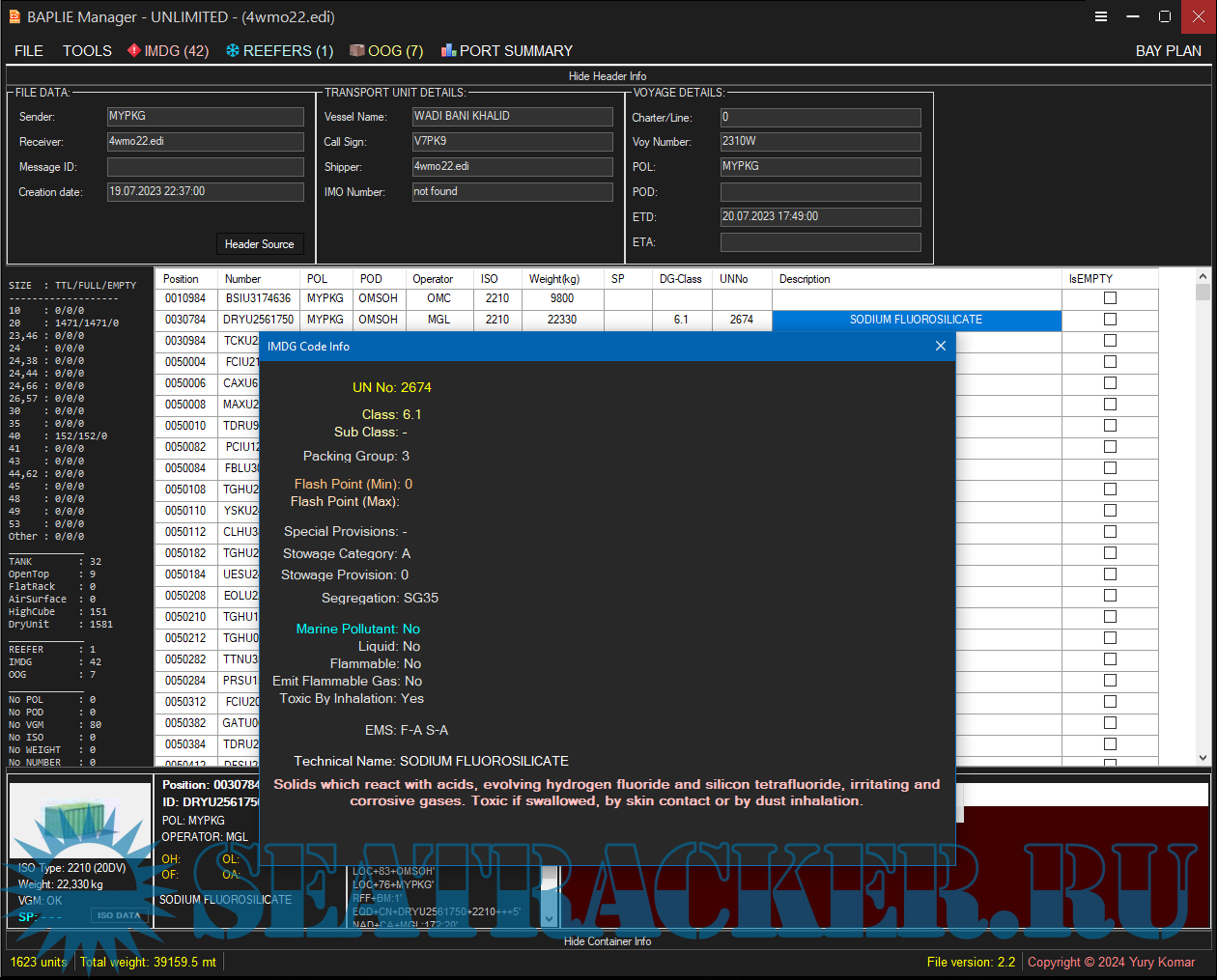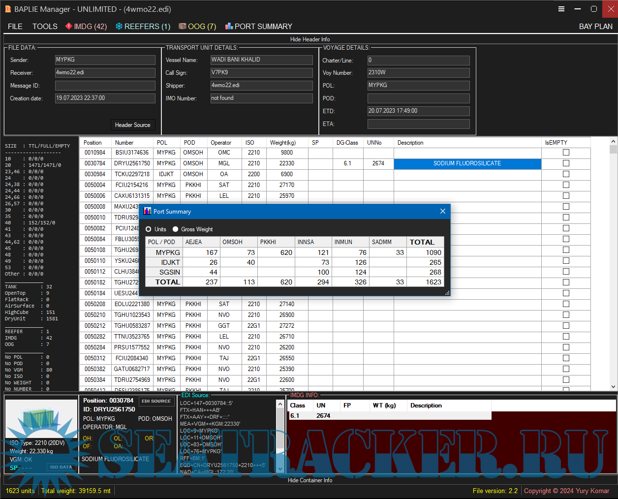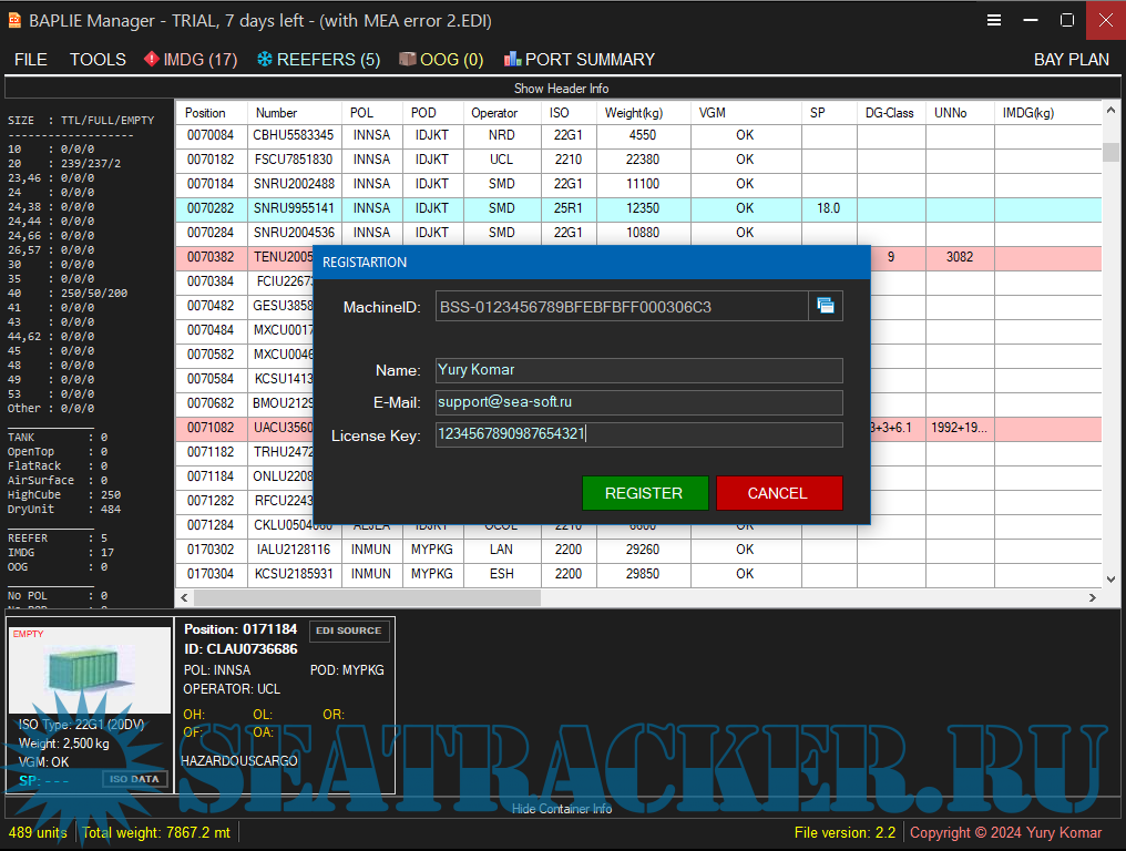 Year: 2024 Version: 1.0.5 Developer: Yury Komar Platform: Windows 64-bit OS compatibility: yes Localization: English Crack: N/A Description: Software for reading and editing BAPLIE files with cargo information for container ships. An application now support a clickable Bay Plan View colored by POL and POD. Available as FREE TRIAL version for 14 days... To Buy The License Please Contact The Developer. There are available some options for licensing your copy of BAPLIE Manager to 1 (10 $), 2 (15 $) or 3 (20 $) computers. Most reliable will be to get few copies for few computers at once. (All further updates are free. Buy once, use always).