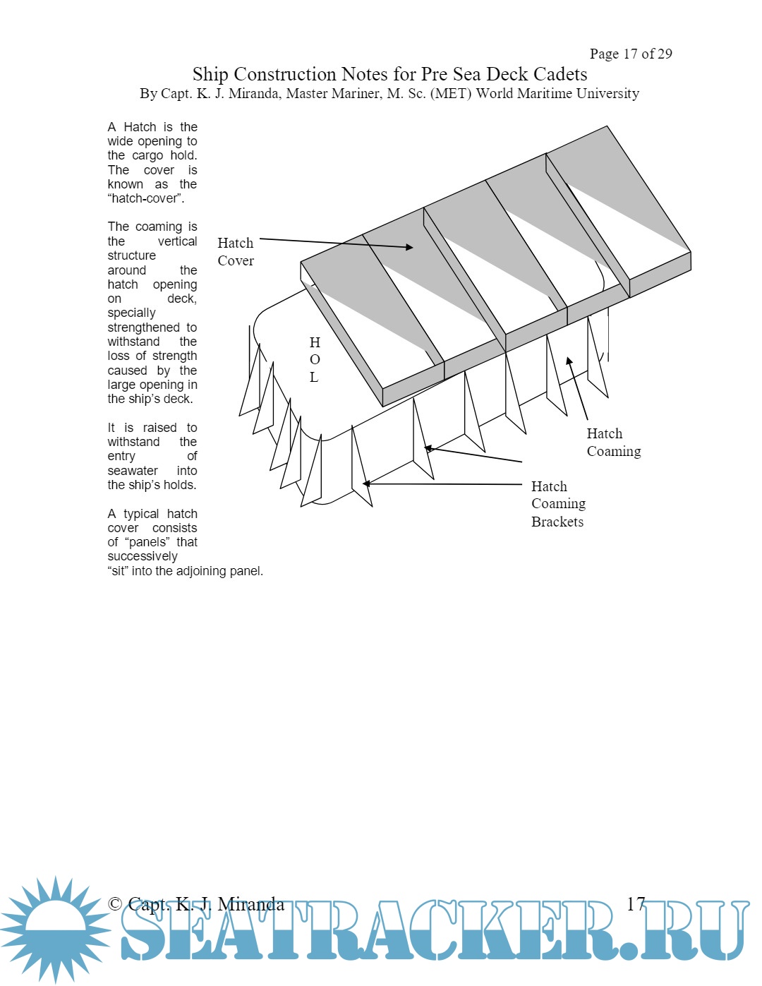 Year: 20xx Language: English Author: HP USER Publisher: Capt. K. J. Miranda Format: PDF Quality: eBook Pages count: 29 Description: Ship Construction – Syllabus (Directorate General of Shipping Guidelines) 7.1.1 Explain in general terms the basic types of ships, i.e. General Cargo, Bulk Carrier, container, and Oil Tanker. 7.1.2 Explain the principal dimension of a ship – LOA, LBP, EB, MB, MD, GT, NT. Name and explain the principal parts of a ship including peak tanks, double bottom tanks, deep tanks, cargo tanks, ballast tanks, etc. 7.1.3 Introduce the following ships plans: General Arrangement, Fire fighting appliances, life saving appliances, pumping and piping arrangements 7.1.4 Explain the following: beam, frame, bulkhead, hatch, tank, coaming, hatch cover, rudder, deck, hull, bilge, sounding pipe, air pipe, ventilator. Show where these are found on a ship. 7.1.5 Explain draft marks & load lines. Explain the method of reading draft marks in feet and metres. 7.1.6 Conduct practical exercises on reading draft by use of a suitable model. 7.1.7 Explain the causes and simple methods of prevention of corrosion in a ship’s structure. Brief notes on paint technology and anti-corrosion techniques.