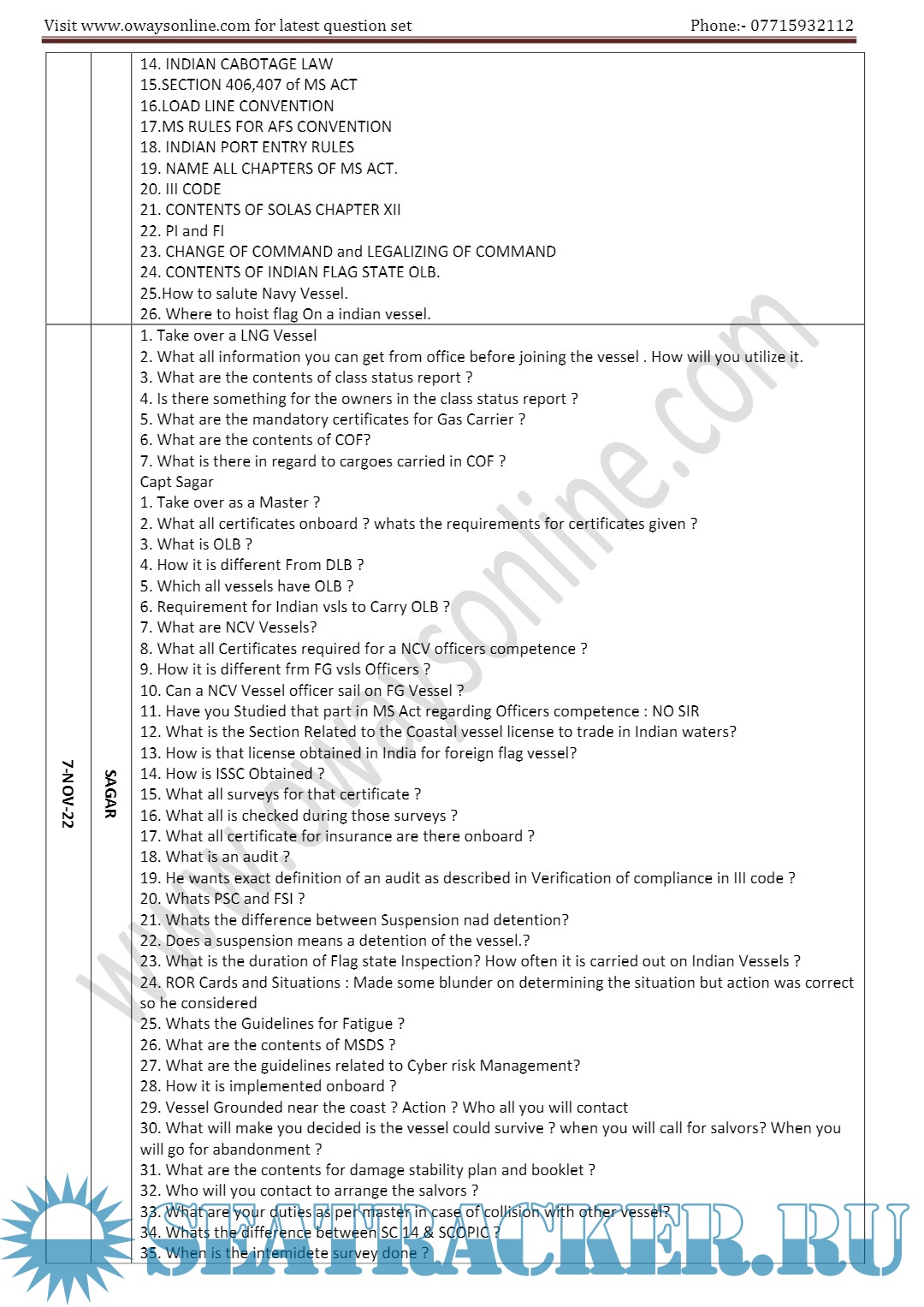 Description: Orals Question Bank for ASM (Advanced Shipboard Management) / Master's Mercantile Marine Department (MMD), India Examinations.