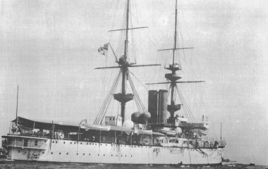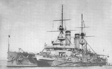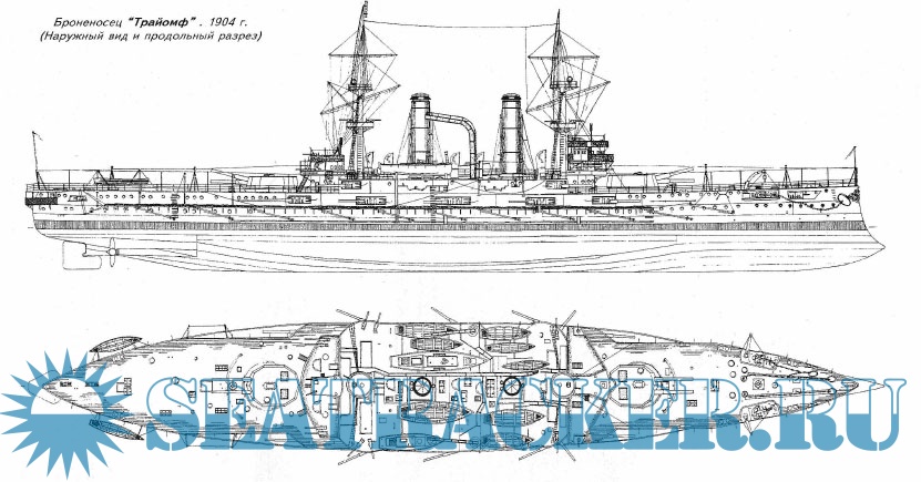 Описание: "В шести милях на SO от Габа-Тепе, оставаясь на ходу, держался на своей позиции "Трайомф". Сети были опущены, все водонепроницаемые двери задраены, прислуга противоминной артиллерии стояла у орудий. Миноносец "Челмерс" 15-узловым ходом кружился вокруг. В 12 ч 25 мин, в тот момент, когда "Челмерс" огибал форштевень "Трайомфа", он заметил на правом его тра-верзе подозрительную белую полоску.