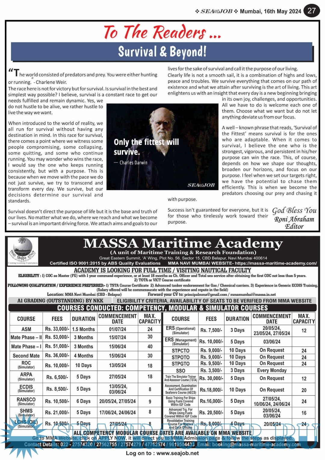 Some notable endeavors of the magazine include the Know Your Recruiter Column, the Sailing Episodes Column and the Marine Insights section. The consistent efforts and the dedication to provide extraordinary services to the industry has resulted in the magnifying popularity and patronage of Sea and Job.