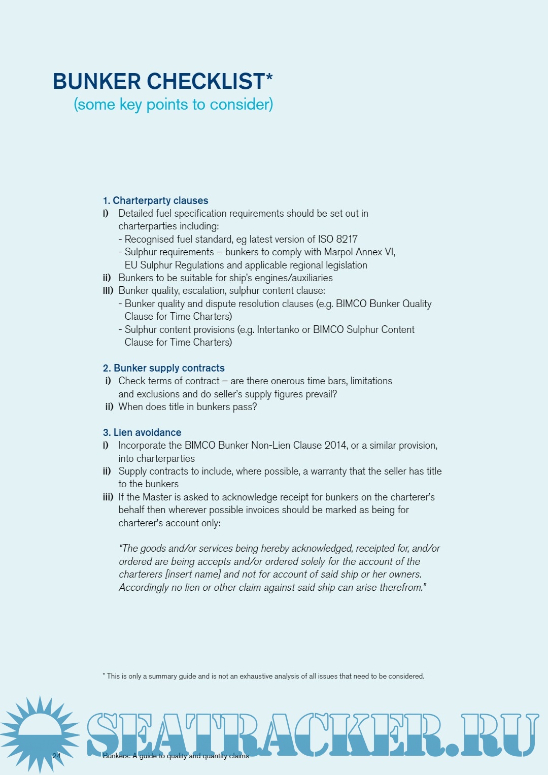On pages 24 to 25 there is a useful checklist summarising some of the key points to consider before, during and after bunkering and in the event of a claim.