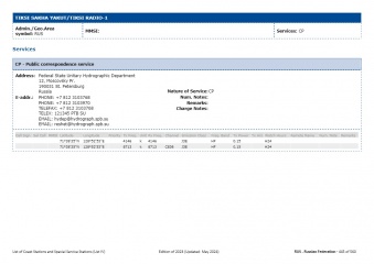 Description: List IV contains important information for the mariner in relation to radiocommunications, including the GMDSS (Global Maritime Distress and Safety System). Detailed information such as the frequencies for transmitting and receiving, in addition to geographical coordinates, is provided for maritime coast radio stations, including those assuming watch-keeping using digital selective calling (DSC) techniques and radiotelephony. List IV also supplies details of additional services such as medical advice, navigational and meteorological warnings, MSI (Maritime Safety Information), AIS (Automatic Identification System), meteorological bulletins and radio time signals, along with the hours of service and operational frequencies, information on port stations, pilot stations, coast Earth stations, VTS stations, contact information of RCC (Rescue Coordination Centers), SAR agencies, Navarea coordinators and AtoNs (AIS Aids to Navigation).As stipulated in Appendix 16 to the RR, this List shall be provided to all ship stations for which a Global Maritime Distress and Safety System (GMDSS) installation is required by international agreement.