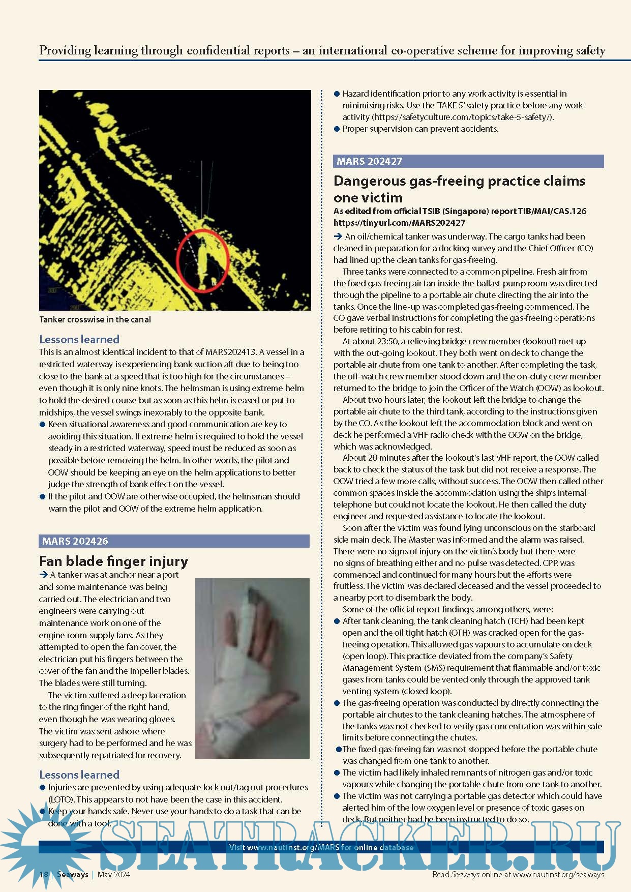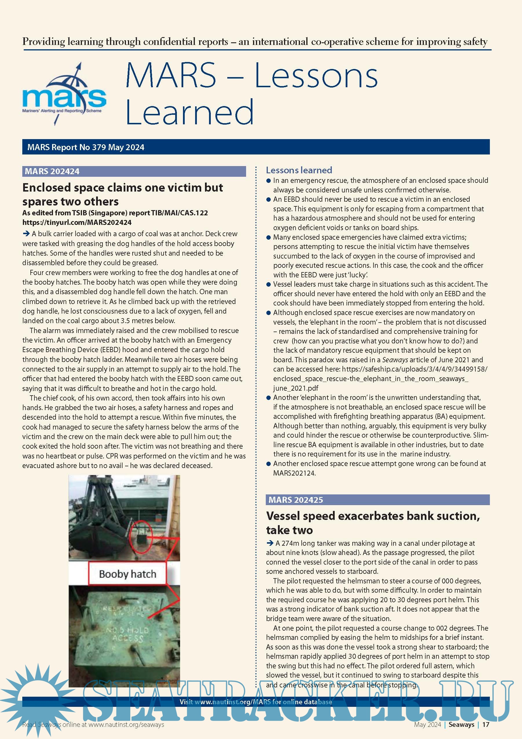 Year: 2024 Language: English Author: The Nautical Institute Genre: Periodical Format: PDF Quality: eBook Pages count: 4 Description: MARS Report No 379 May 2024 Providing learning through confidential reports – an international co-operative scheme for improving safety.MARS is a searchable database containing reports of accidents and near misses stretching back over a quarter of a century. Funded through the generous support of the Institute's Nautical Affiliate partners, it is one of the maritime industry's leading risk reduction initiatives and is helping to make life safer for seafarers everywher.