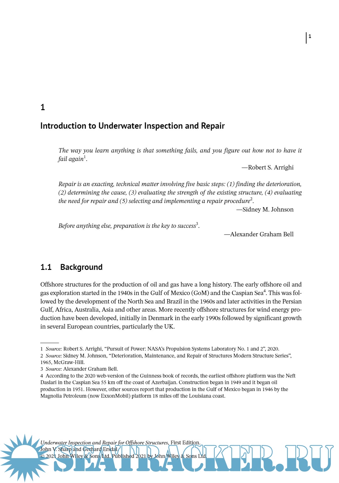 Year: 2021 Language: English Author: John V. Sharp & Gerhard Ersdal Publisher: John Wiley & Sons Ltd. Edition: Kindle | 1st ISBN: 9781119633822 Format: PDF Quality: eBook Pages count: 361 Description: Benefit from a much-needed, up-to-date handbook on underwater inspection and repair processes and technologies Underwater Inspection and Repair for Offshore Structures fills a gap in the literature to provide an overview of the inspection and repair processes for both steel and concrete offshore structures. Authors and noted experts on the topic John V. Sharp and Gerhard Esdal guide readers through the reasons why inspection and repair are performed and how both are linked to the management of structural integrity, statutory requirements, and various types of damage. The book addresses critical topics, including the execution and planning of inspection and repair, the tools and methods used, and their deployment underwater. The authors put particular focus on steel and concrete offshore oil and gas installations, but the content is also applicable to the substructures of offshore wind turbines. Underwater Inspection and Repair for Offshore Structures is complementary to the authors’ book Ageing and Life Extension of Offshore Structures, also from Wiley. This important book: • Covers current inspection and monitoring techniques to evaluate existing structures • Includes coverage of robotic (ROV) inspection and repair methods • Provides an overview of repair and maintenance techniques applicable to the splash zone and underwater operations Written for engineers, designers, and safety auditors working with offshore structures. Underwater Inspection and Repair for Offshore Structures is a comprehensive resource for understanding how to effectively inspect and repair these vulnerable structures.