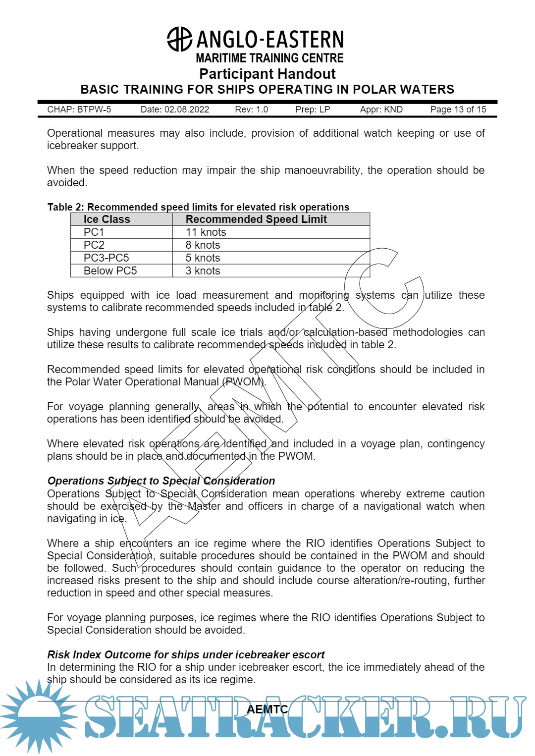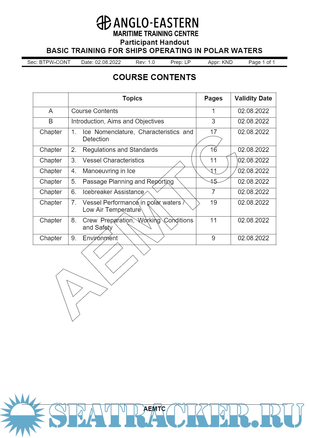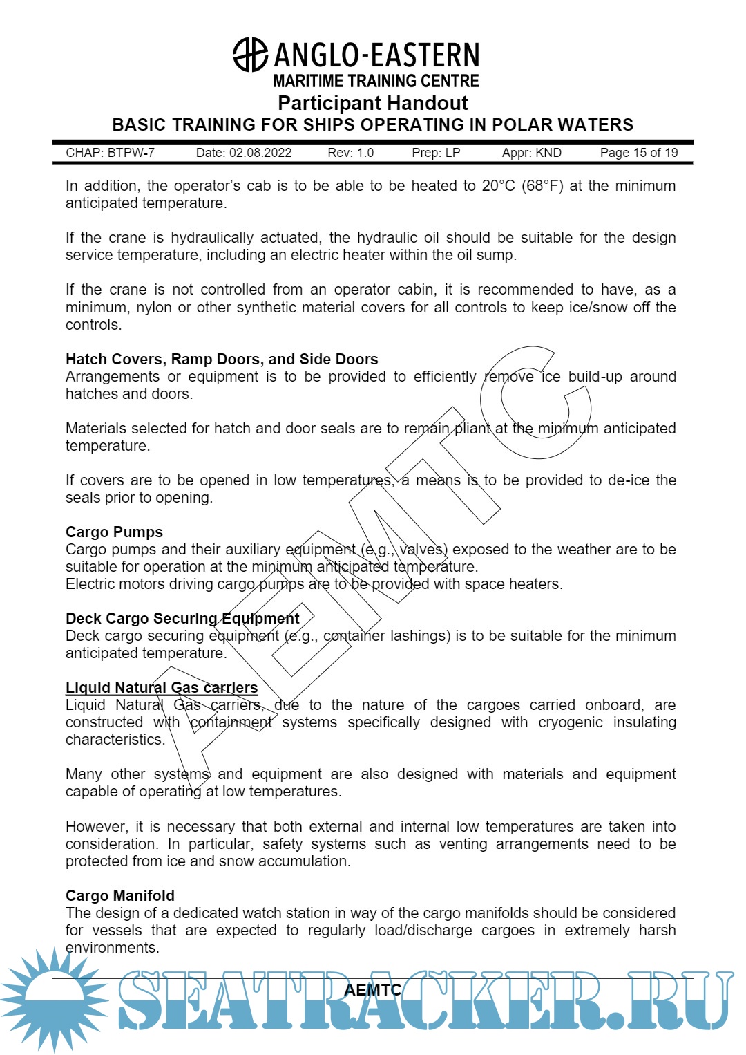 Year: 2022 Language: English Author: AEMTC Genre: Training courses Publisher: Anglo Eastern Maritime Training Centre (AEMTC) Edition: Rev. 1.0 Format: PDF Quality: eBook Pages count: 121 Description: Basic Training for Polar Waters A Five Days Course for Deck Officers. Participant Handout. Aim of this course: This course provides training to navigation officers to operate ships in polar waters and to address those additioanl provisions deemed necessary for consideration beyond existing requirements of the SOLAS & MARPOL Conventions, in order to take into account the climatic conditions of polar waters and to meet appropriate standards of maritime safety and pollution prevention.