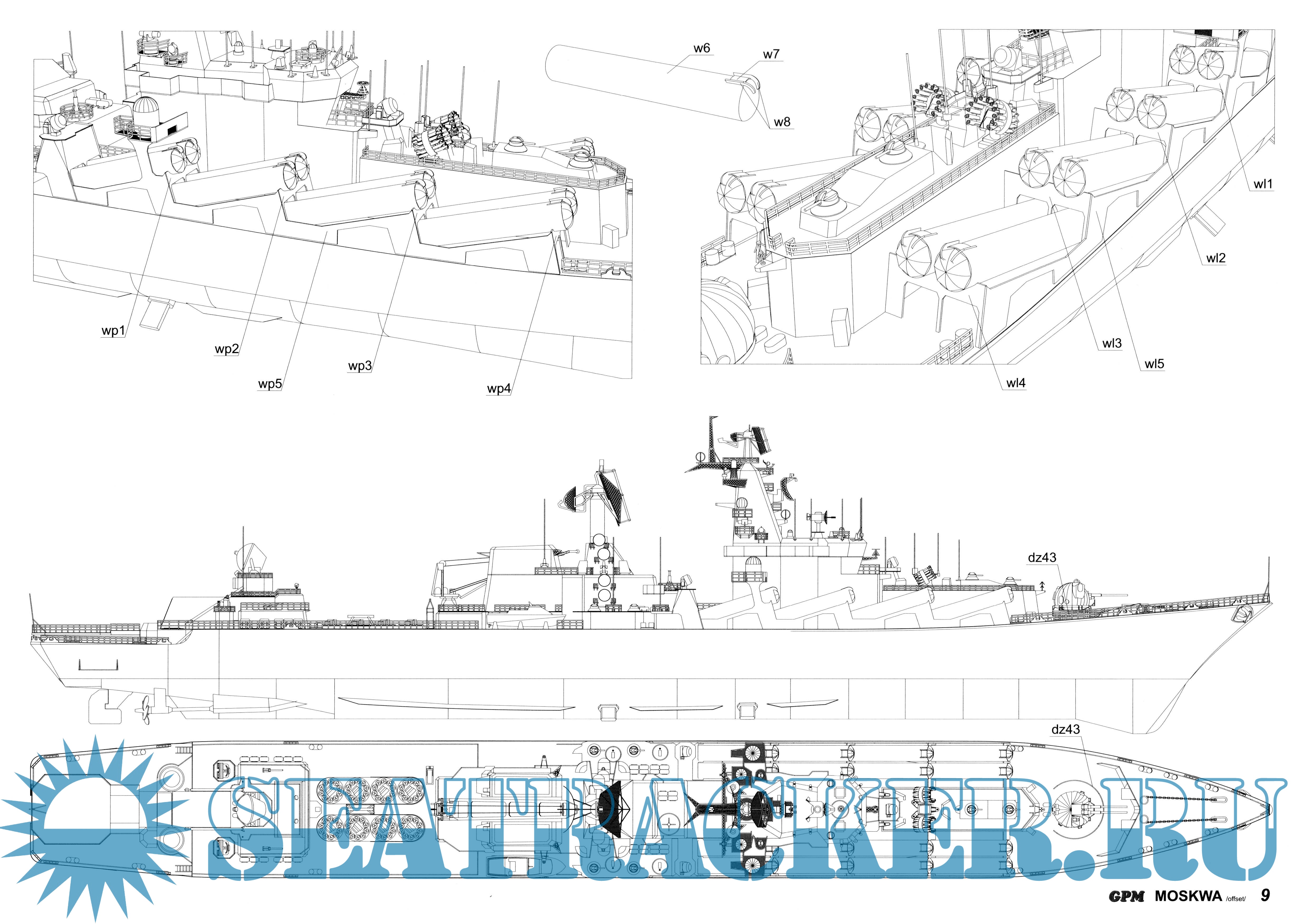 41 лист цветных выкроек и инструкций для изготовления бумажной модели ракетного крейсер "Москва" в масштабе 1:200Скриншоты