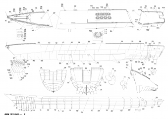 Описание: 41 лист цветных выкроек и инструкций для изготовления бумажной модели ракетного крейсер "Москва" в масштабе 1:200