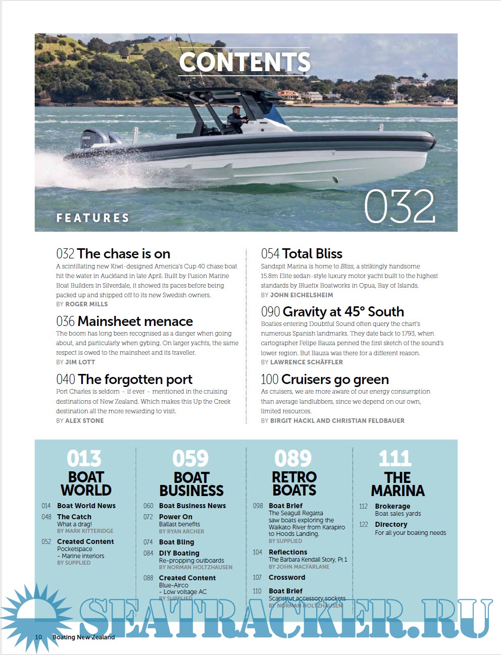 Description: Boating NZ is New Zealand's premier marine title devoted to putting its readers behind the wheel of the latest trailerboats, yachts and launches to hit the market. It inspires with practical content and cruising adventures, leads the fleet with its racing coverage and is on the pulse of the latest maritime news and innovation