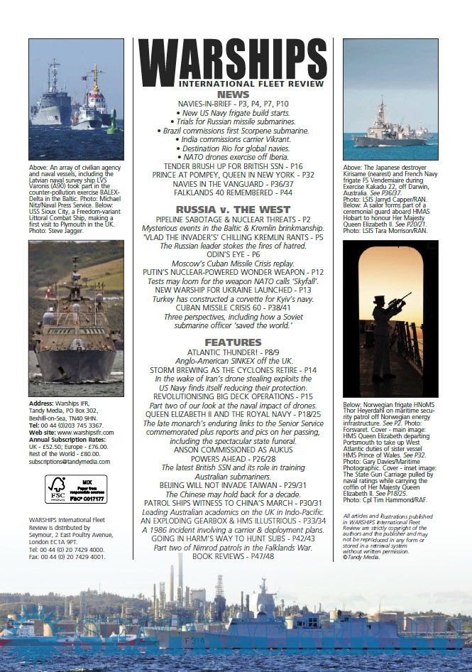 Description: Warships IFR puts the spotlight on the latest developments in the world’s navies. It covers current defence issues and has comments by leading analysts. The magazine regularly includes features on the Royal Navy and the US Navy in addition to incorporating news and features on all other navies across the globe. Warships IFR frequently carries in-depth articles on naval heritage.WARSHIPS International Fleet Review is published 12 times a year by Tandy Media Ltd who also publish Shipping Today & Yesterday (which provides news and features from the world of merchant shipping).