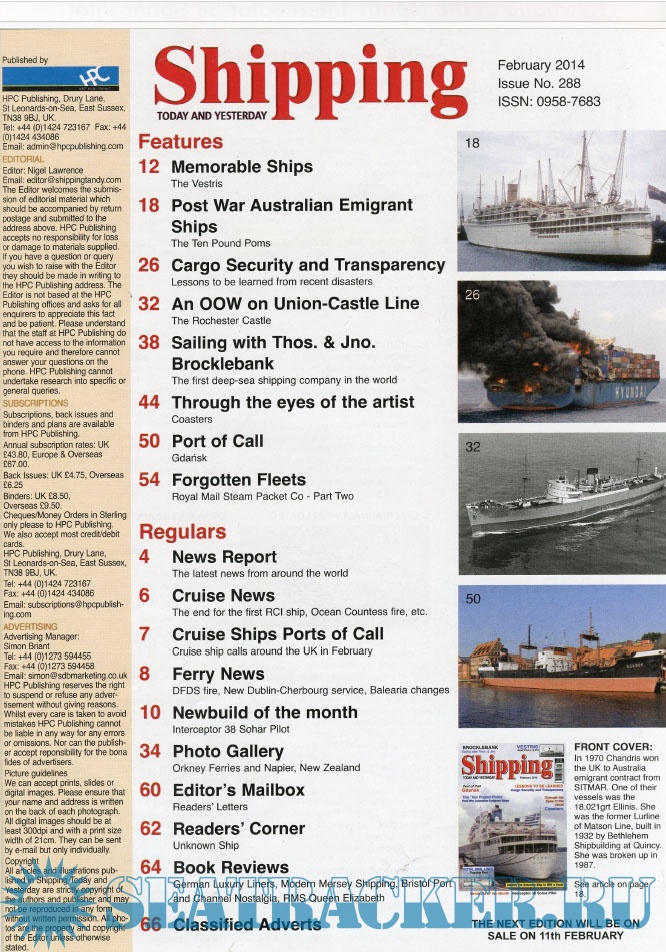 Year: 2014 Language: English Author: Nigel Lawrence (Editor) Edition: 2014-02 Format: PDF Quality: Scanned pages Pages count: 66 Description: Shipping Today & Yesterday Magazine is a monthly magazine for the shipping enthusiast offering up-to-date information, topical and in-depth historical articles alongside images, many of which are exclusive to the magazine.Shipping Today & Yesterday is a specialist magazine for the shipping enthusiast offering up-to-date information, topical and in-depth historical articles.Shipping Today & Yesterday was first produced in March 1990 by, the then Editor and Publisher, John Young. The first edition stated that it would, “offer a news service covering important developments in the Shipping industry Today and will look back at ships and events of Yesterday, with regular features on merchant ships.